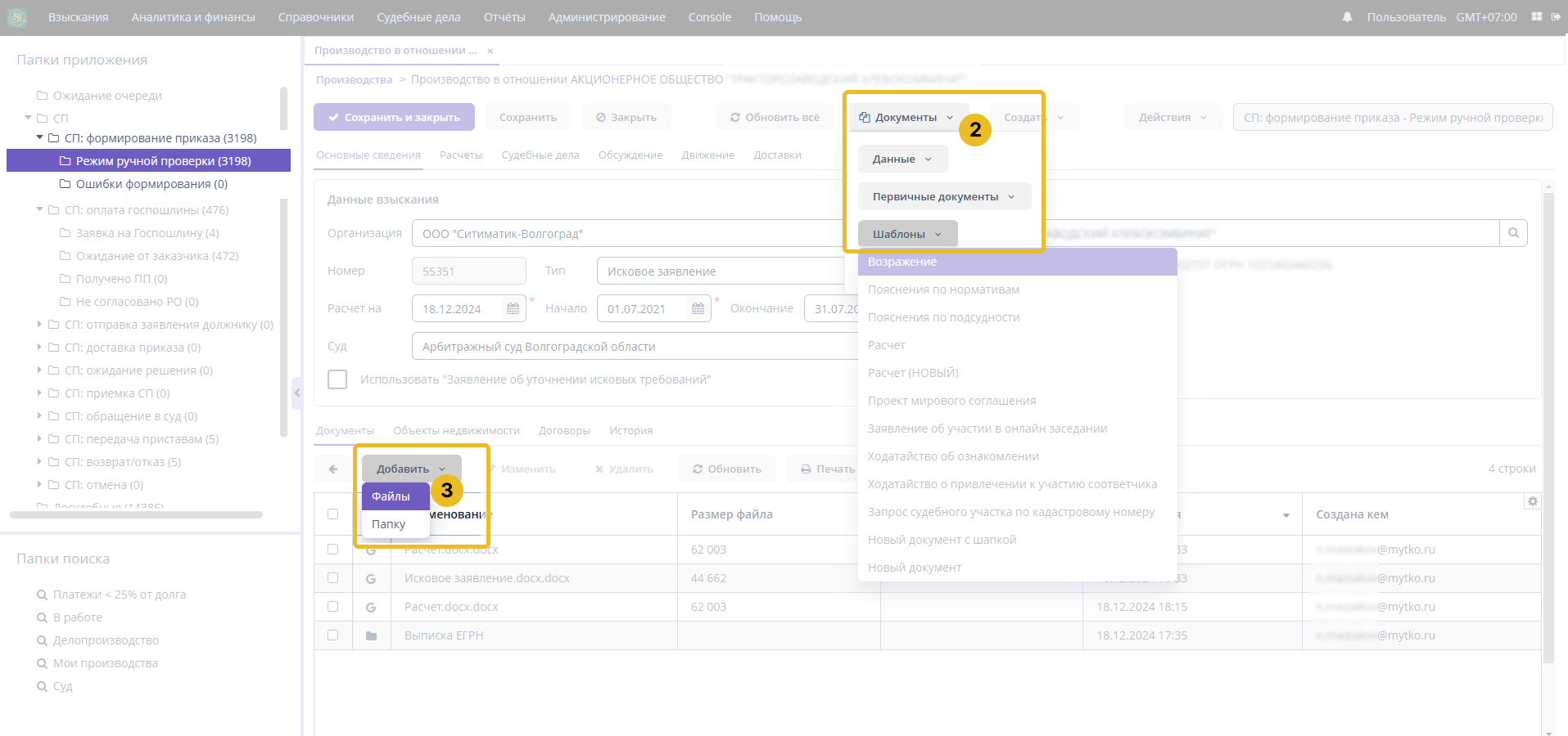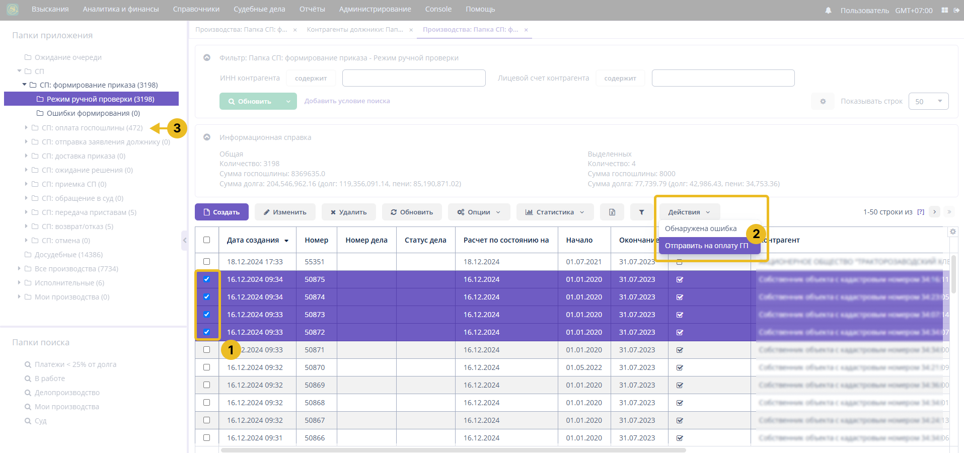- Производству присваивается следующий этап и статус, оно попадает в папку “СП: оплата госпошлины” и подпапку “Заявка на госпошлину”.
