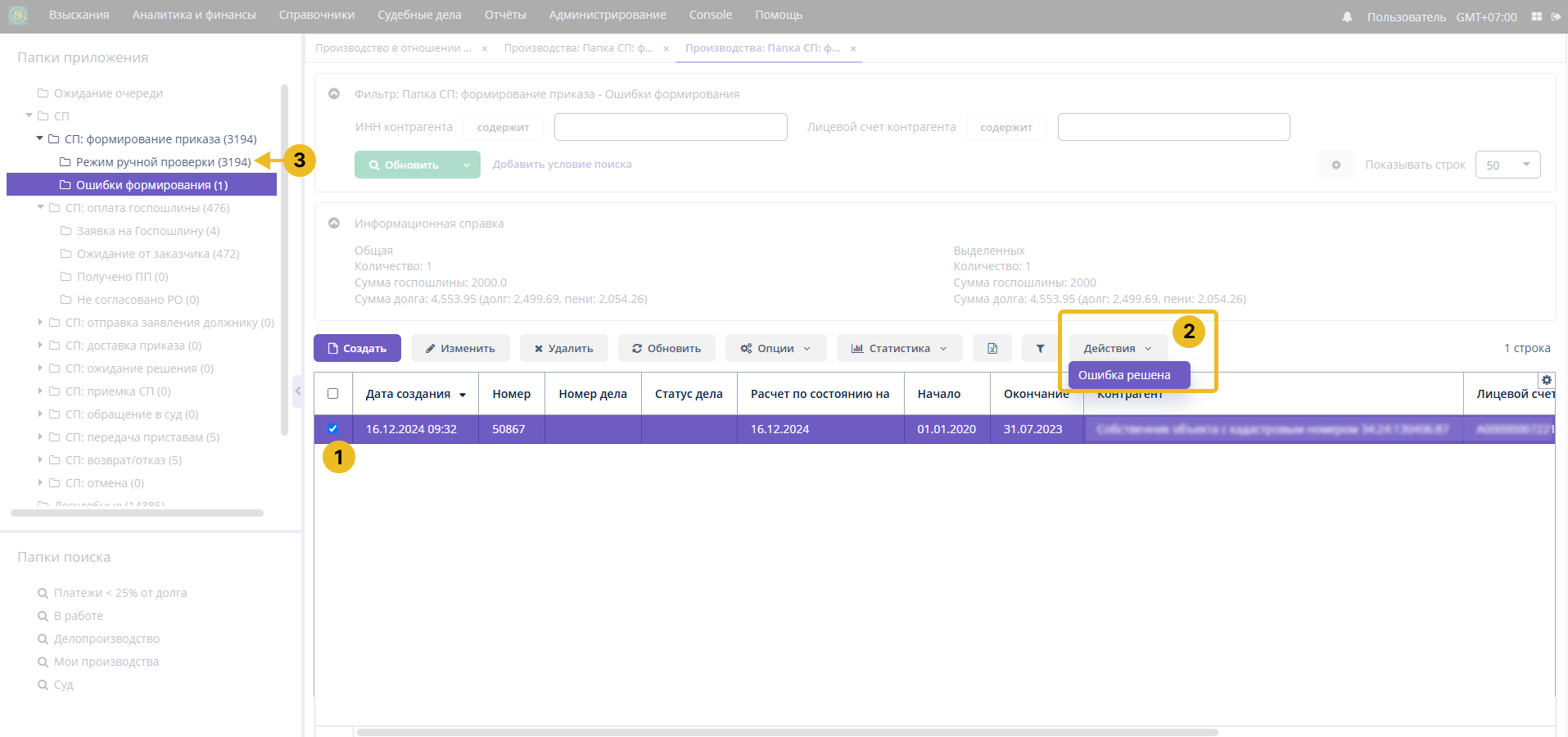 - Режим ручной проверки (этап “СП: формирование приказа”, статус “Режим ручной проверки”)