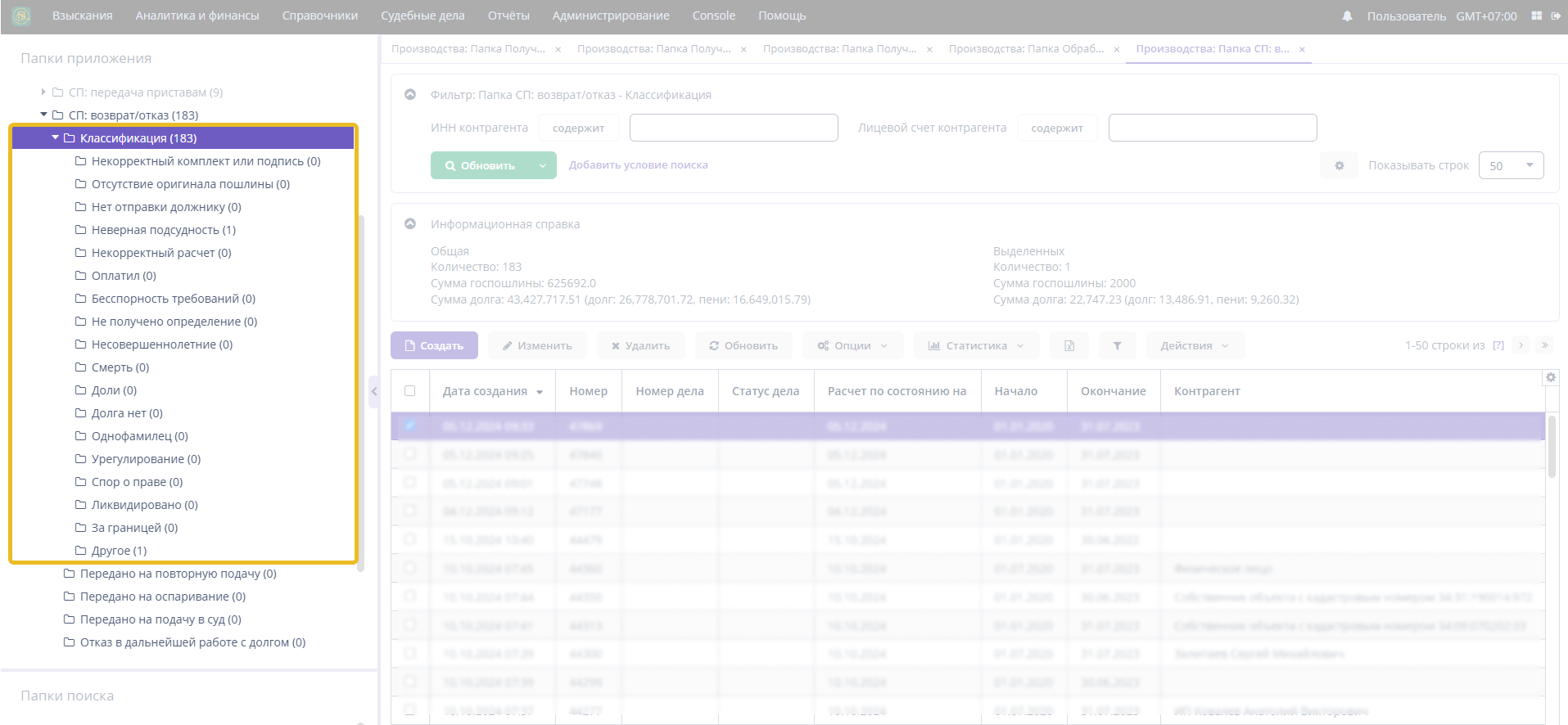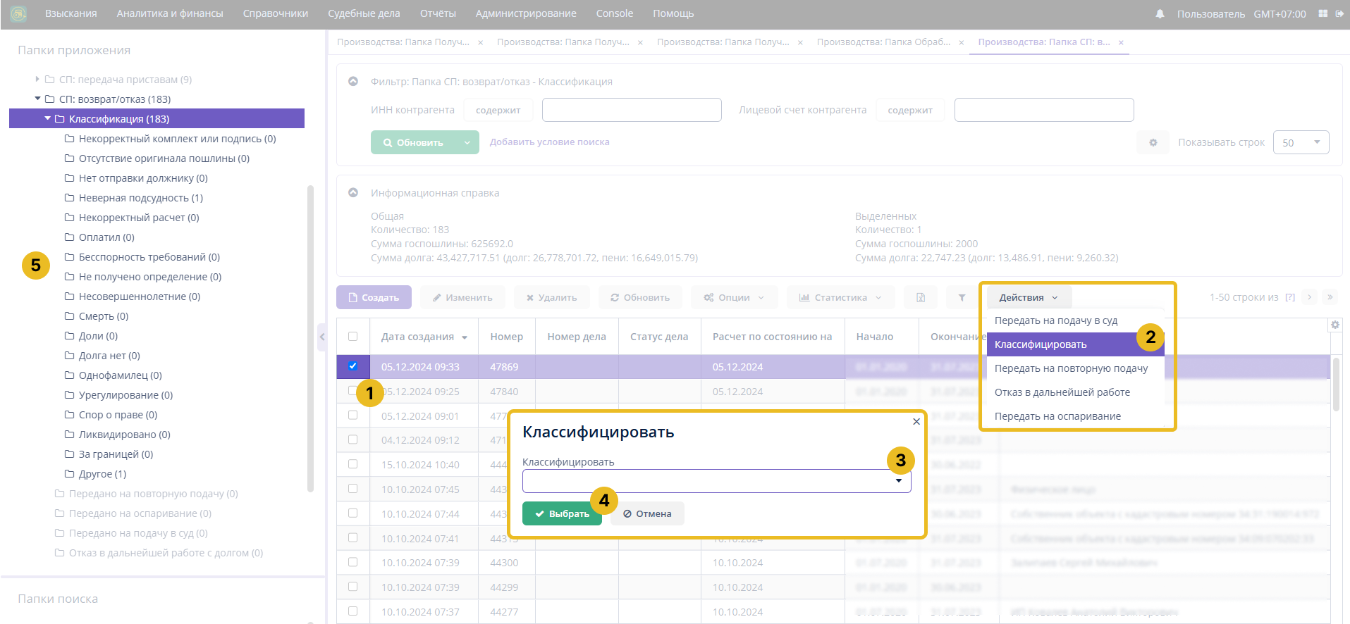 - Классификация (этап “СП: возврат/отказ”, статус “Классификация”)