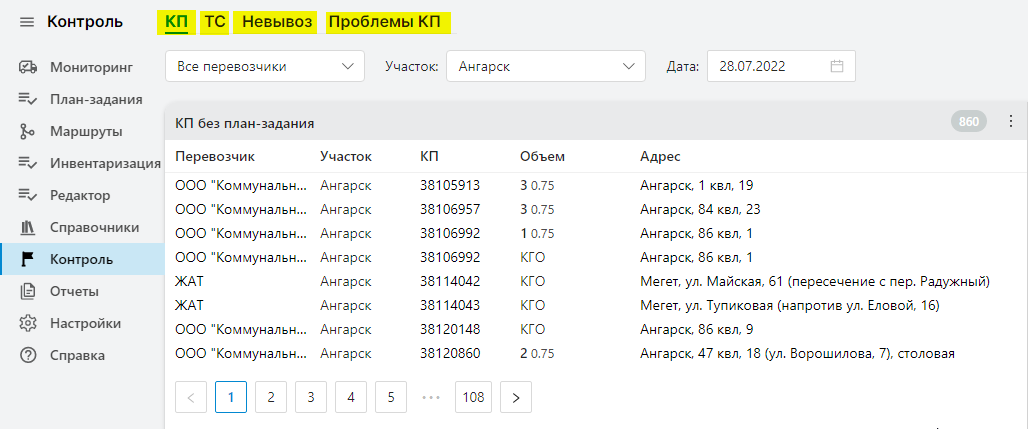 Раздел Контроль - инструмент для отслеживания важных событий по вывозу КП и траспортным средствам. Контроль включает