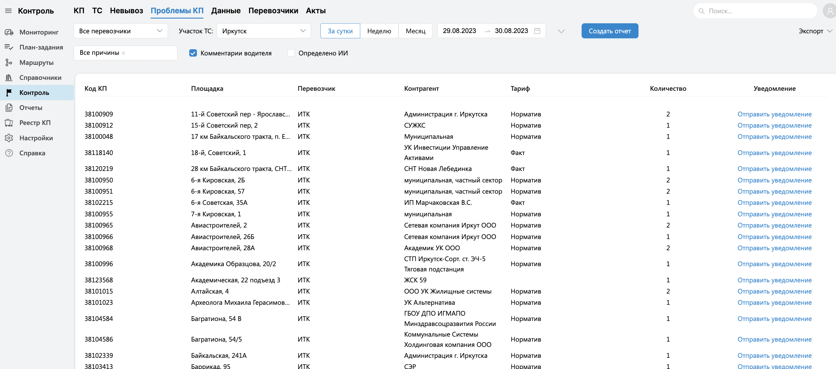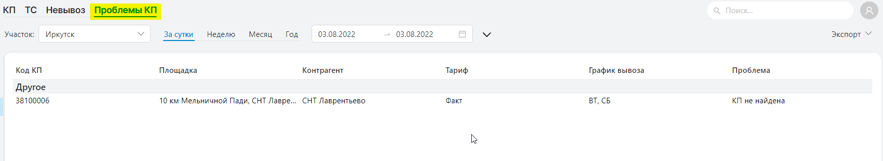 - в отчет по проблемам попадают КП, которые были вывезены, но по ним водитель указал проблему.