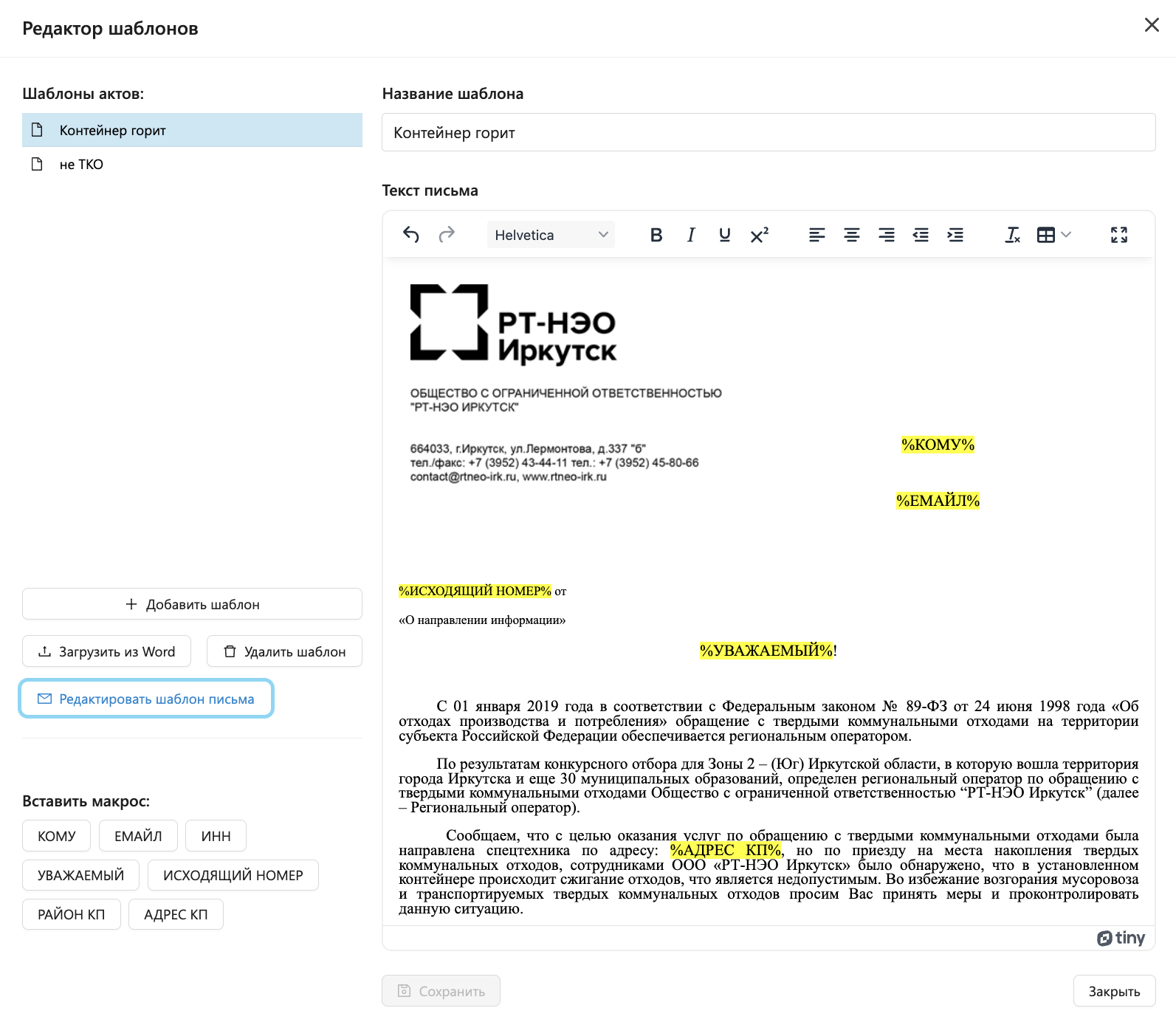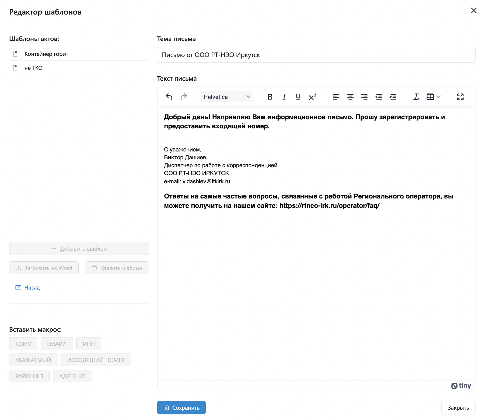 - Вставьте в текст письма необходимые макросы: кому, email, ИНН, Уважаемый, Исходящий номер, район КП, адрес КП.