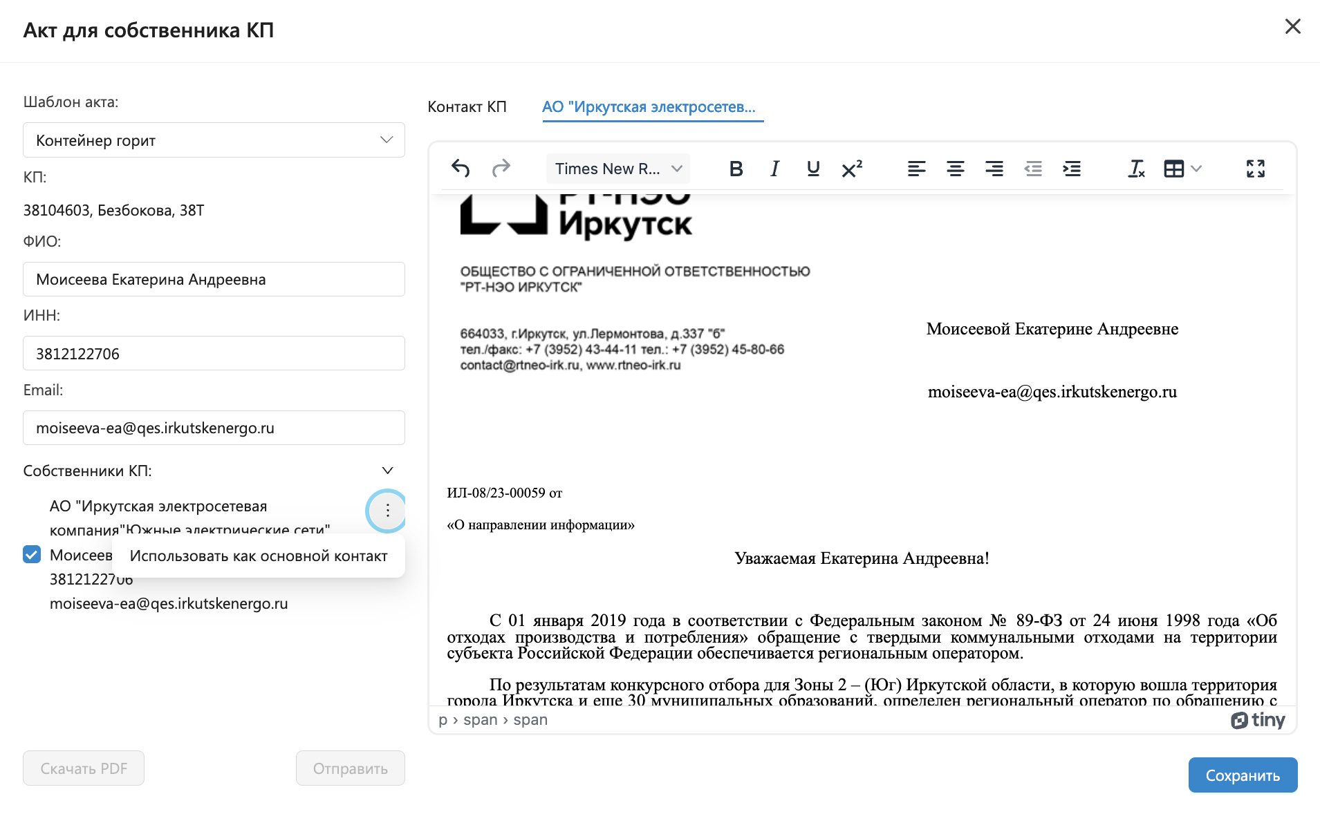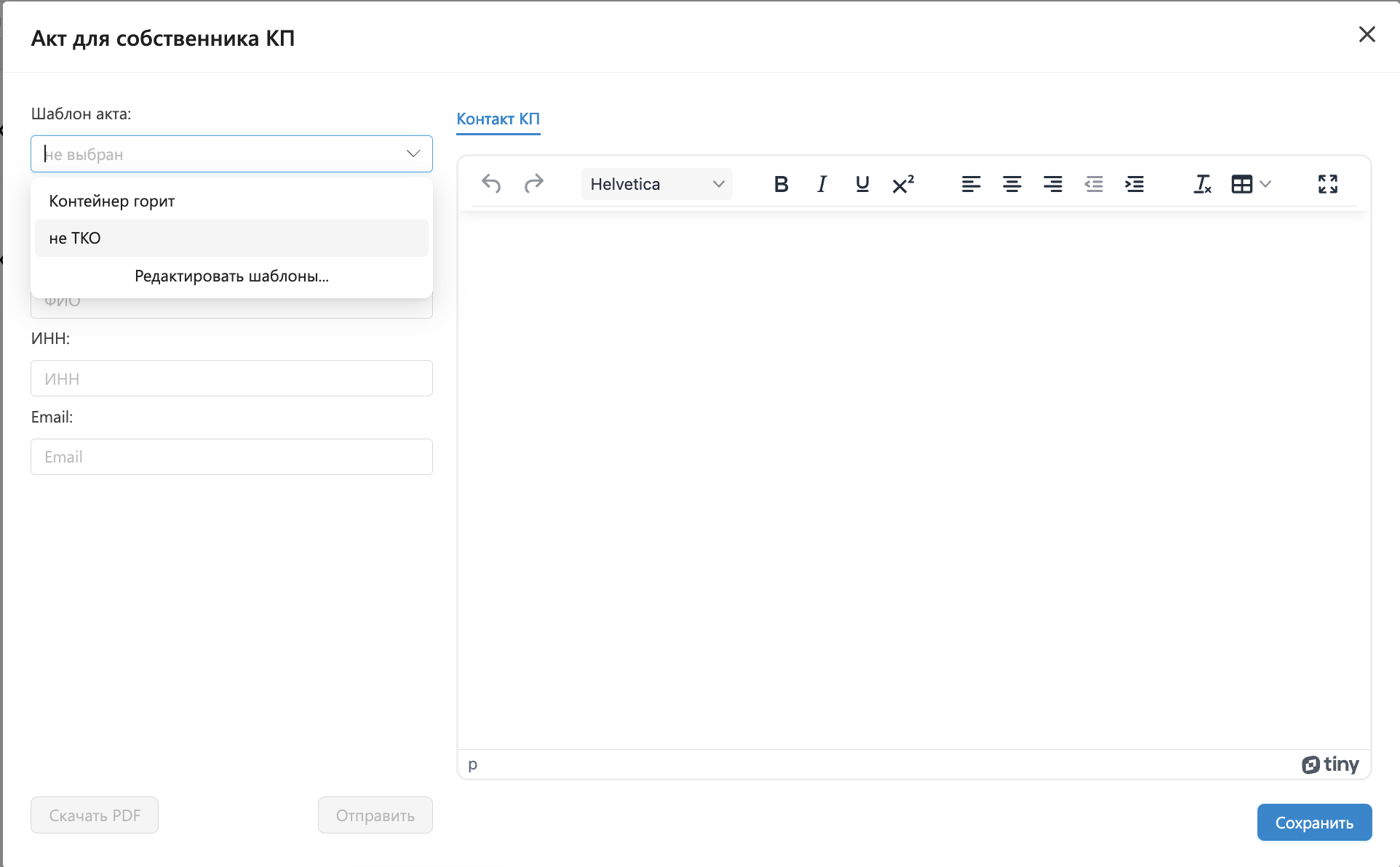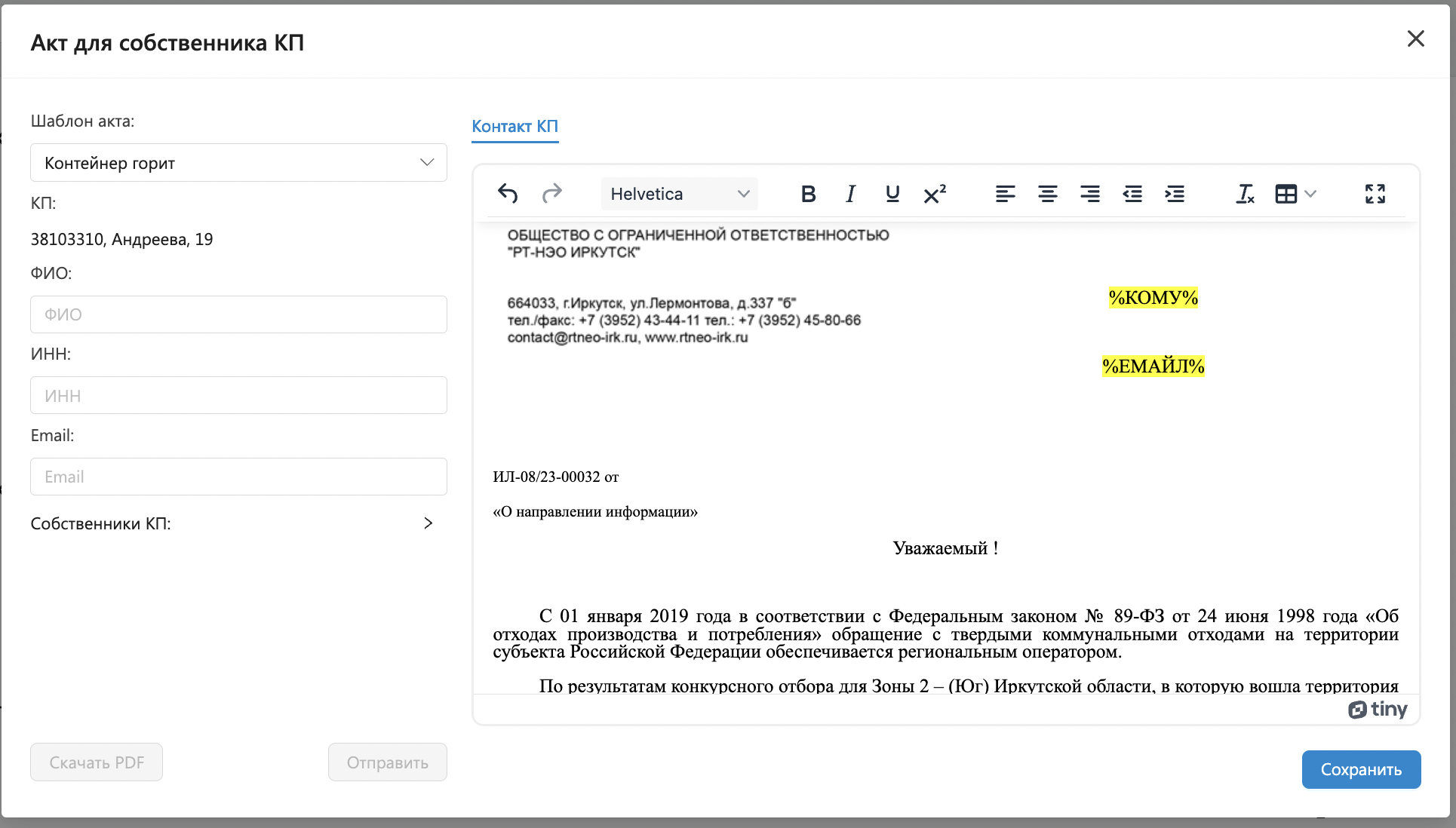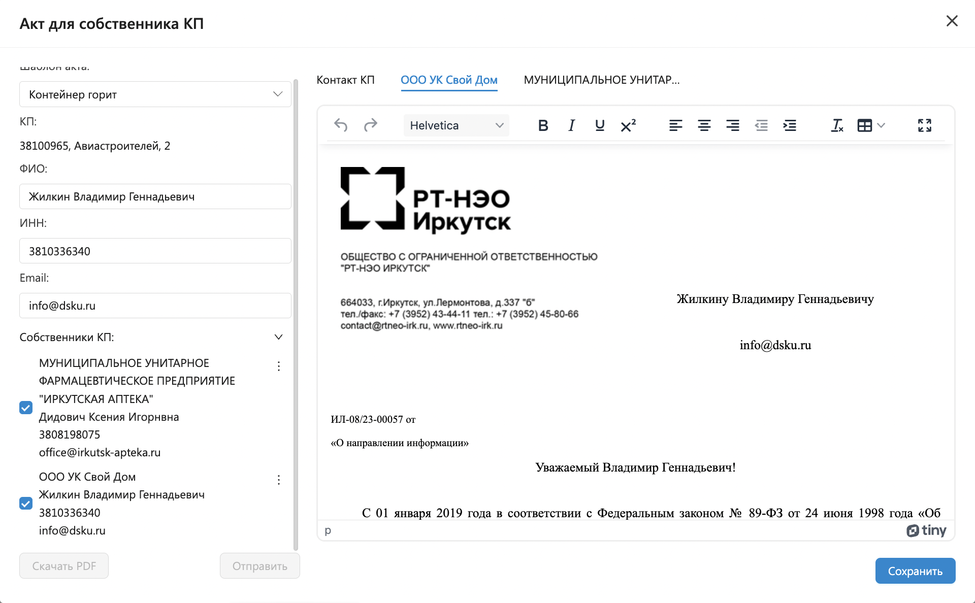 Подготовленный текст уведомления необходимо сохранить перед отправкой. После сохранения становится доступным отправка уведомления по электронной почте или скачивание в формате PDF. Сохраненый акт попадает в раздел Контроль - Акты.