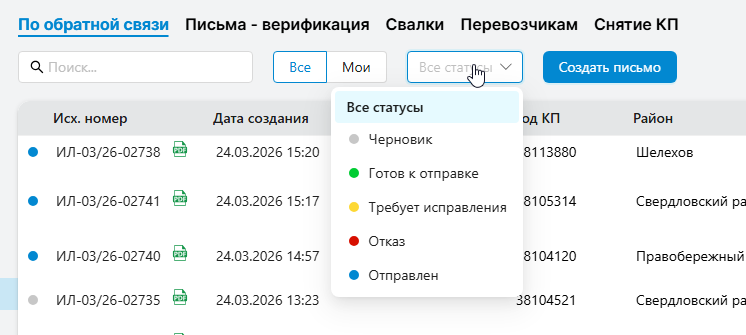 Раздел "Письма" позволяет создать и отправить контрагентам письма о деятельности перевозчиков ТКО и регоператора на их контейнерных площадках. Письма делятся на четыре категории: