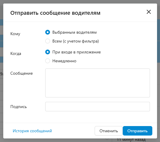 Администратор может отправлять текстовые сообщения в приложение выбранных водителей или всем водителям выбранных перевозчиков.
