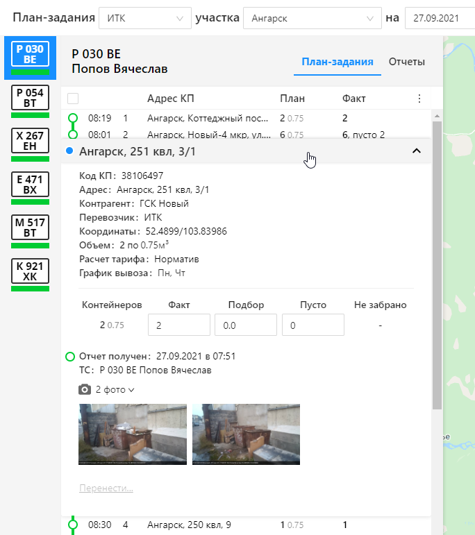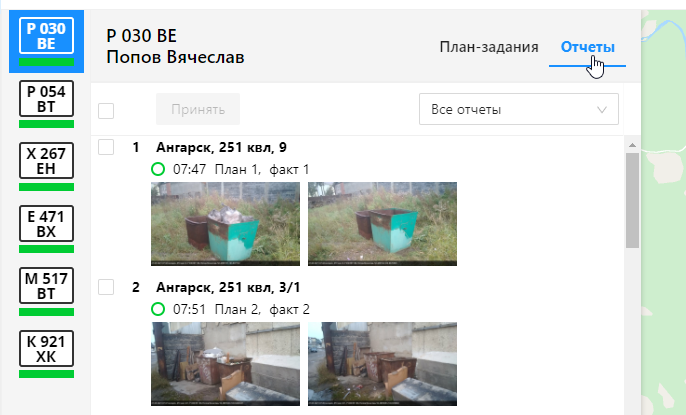 Переключитесь на вкладку Отчеты, чтобы увидеть ленту отчетов водителя за выбранную дату.