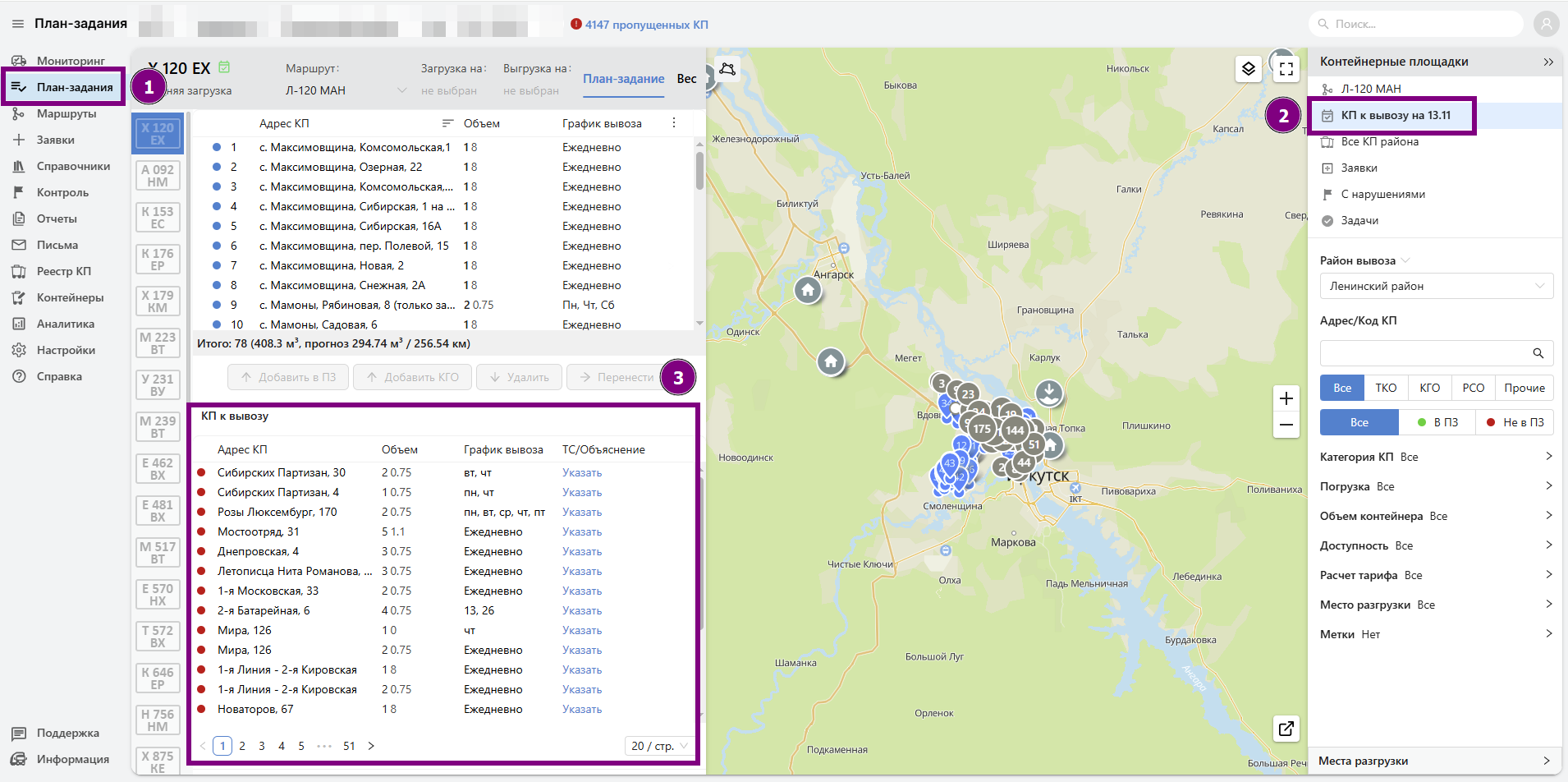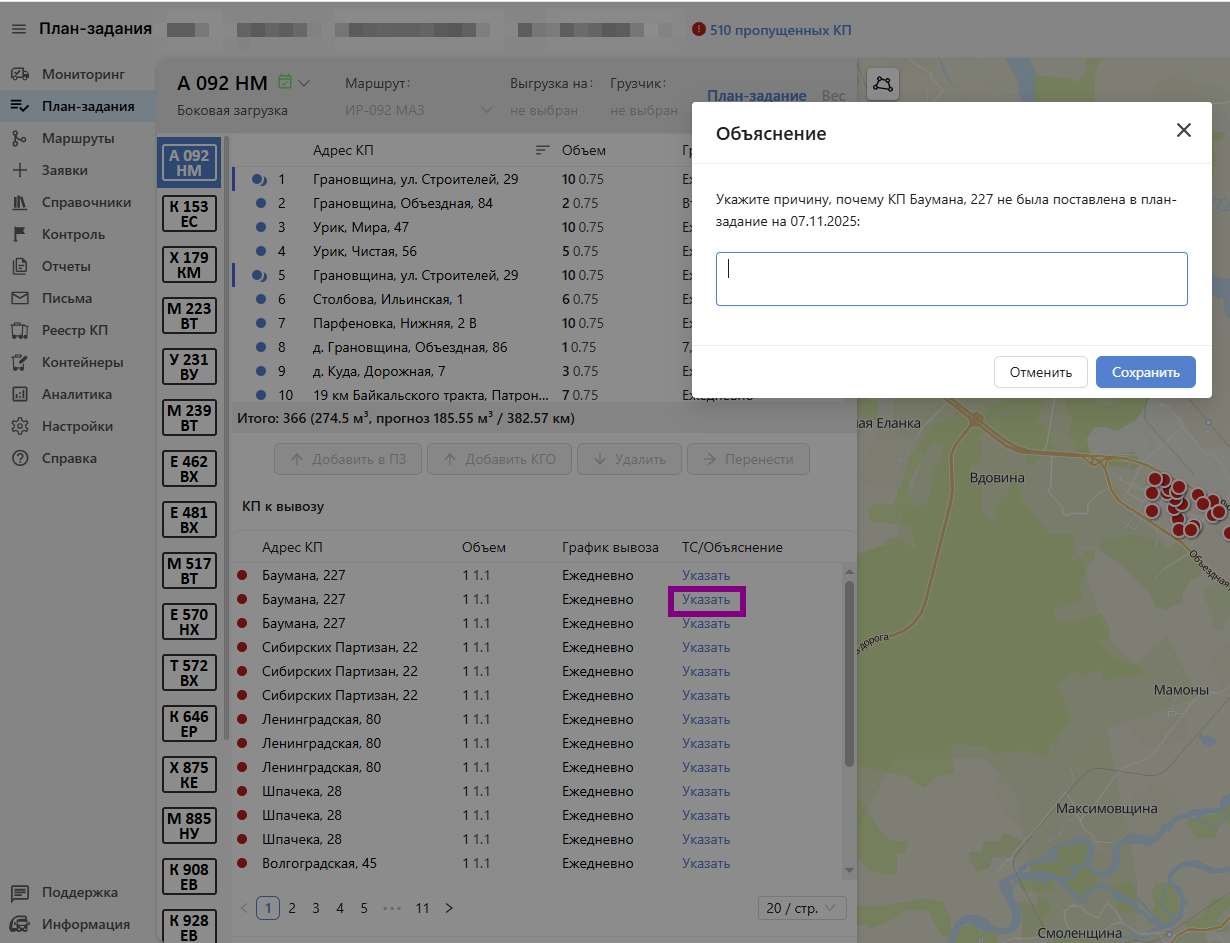 Пропущенной считается КГ, которая одновременно не поставлена в ПЗ и не указано объяснение. Если число пропущенных КГ по всем участкам перевозчика больше нуля, в заголовке показывается ссылка-предупреждение: