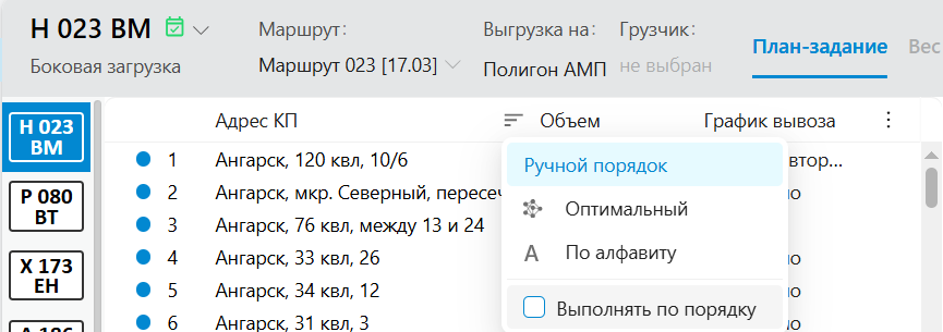Если выбрана сортировка «По порядку выполнения», водитель может выполнять отмеченные план-задания только последовательно — от первой КП до последней.