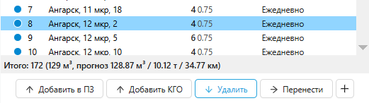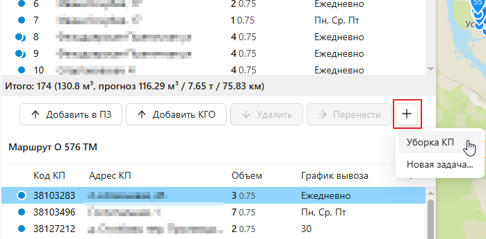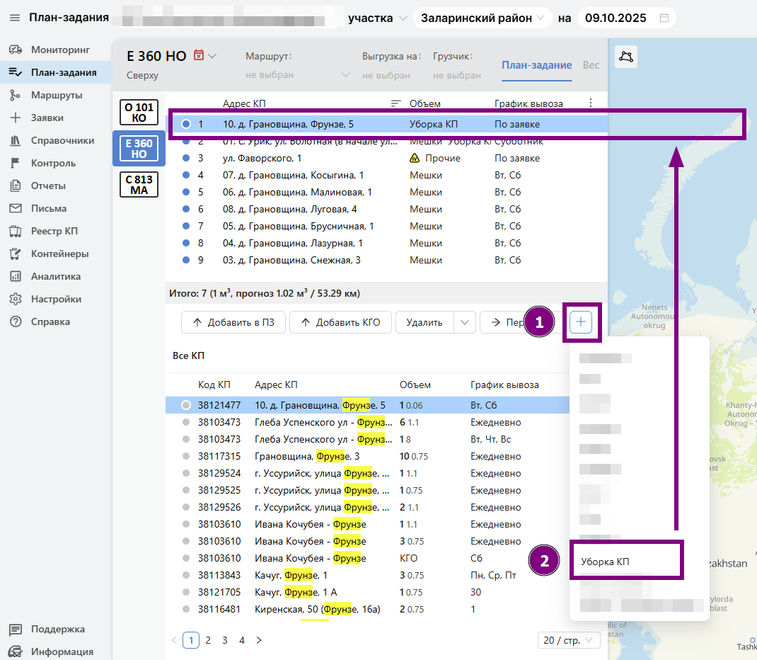 Чтобы добавить КП в план-задание, выберите ее в нижней таблице и нажмите "Добавить в план-задание". Используйте поиск по адресу или коду КП в области фильтров, чтобы найти КП.