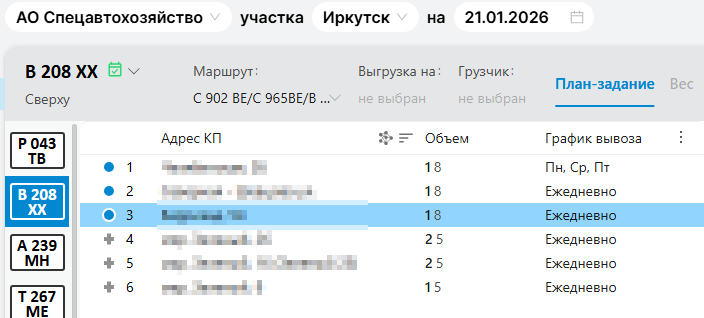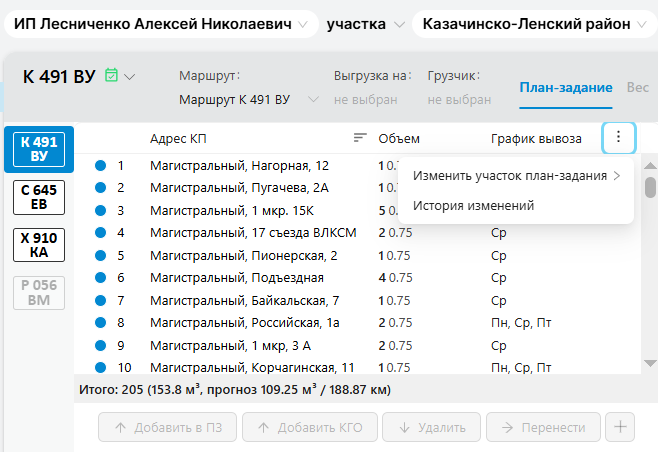 Чтобы изменить участок план-задания, в редакторе план-заданий выберите дату, перевозчика и ТС. Нажмите троеточие и выберите «Изменить участок план-задания». Откроется список доступных участков. После выбора участка план-задание обновится на новый участок, ТС останется прежним.
