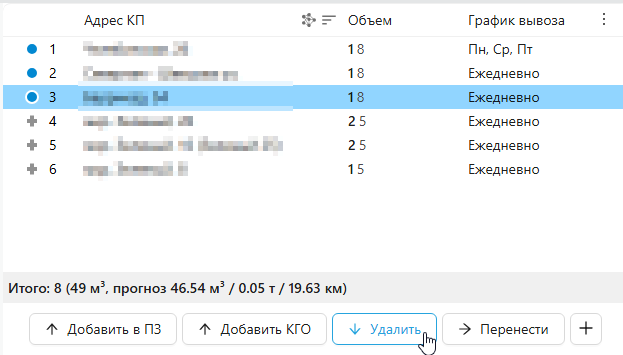 Чтобы удалить КП из план-задания, выберите его в верхней таблице и нажмите "Удалить".