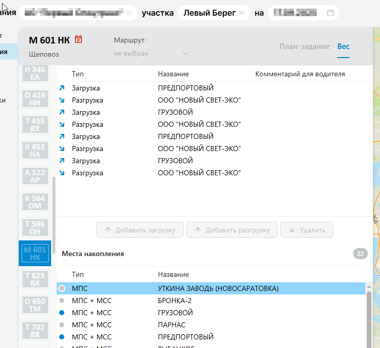 - Перейдите в редактор план-заданий, выберите ТС 2-го плеча и на вкладке "Вес" добавьте места его загрузок и разгрузок в весовое план-задание, используя кнопки "Добавить загрузку", "Добавить разгрузку".