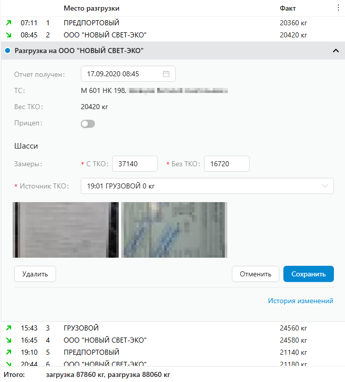Отчеты о загрузке/разгрузке, который формирует водитель в мобильном приложении, содержат вес с ТКО / без ТКО. При необходимости выбранные значения можно скорректировать.