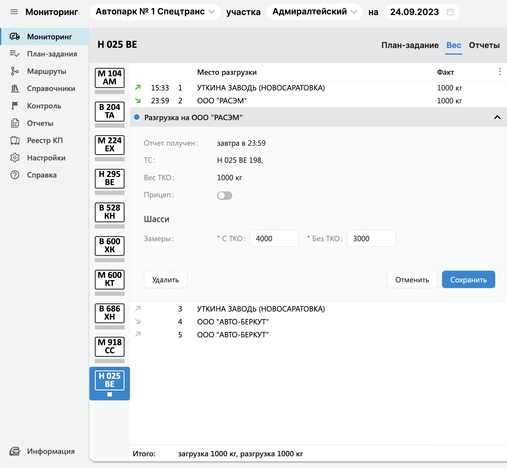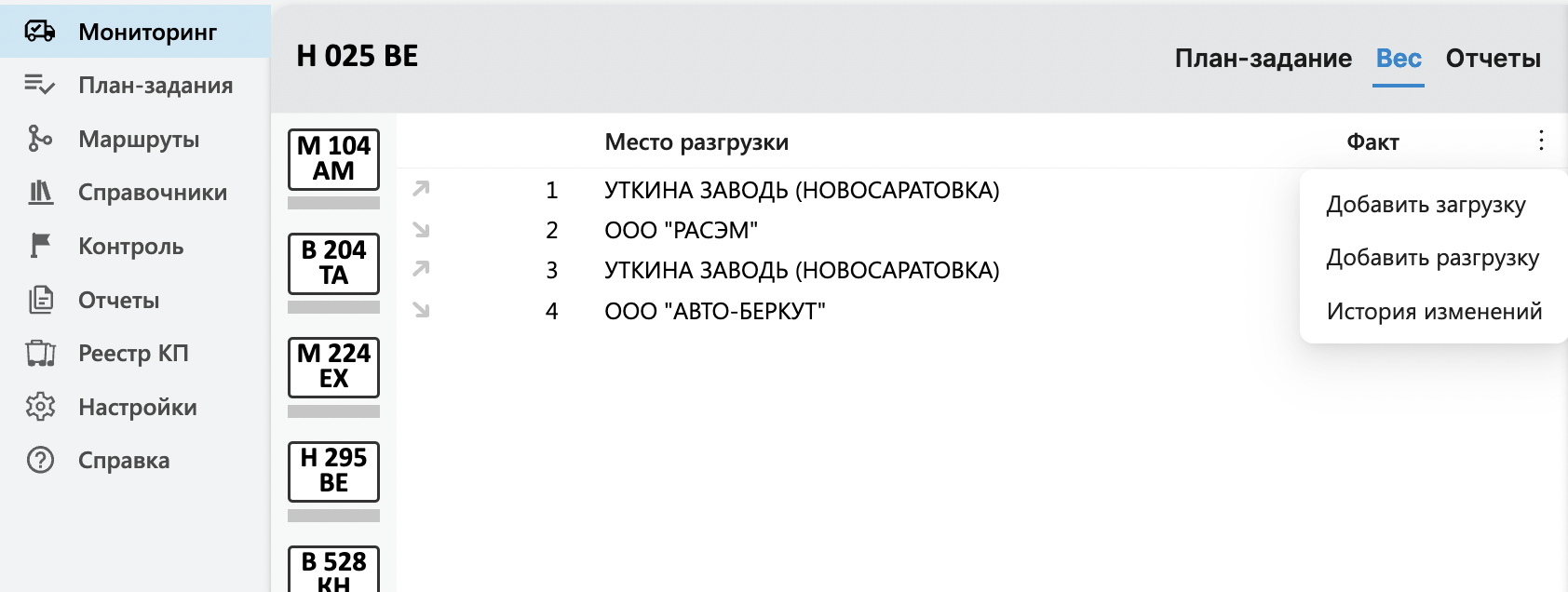 На вкладке "Вес" в Мониторинге также, как и в редакторе план-заданий, можно добавить удалить загрузку/разгрузку.