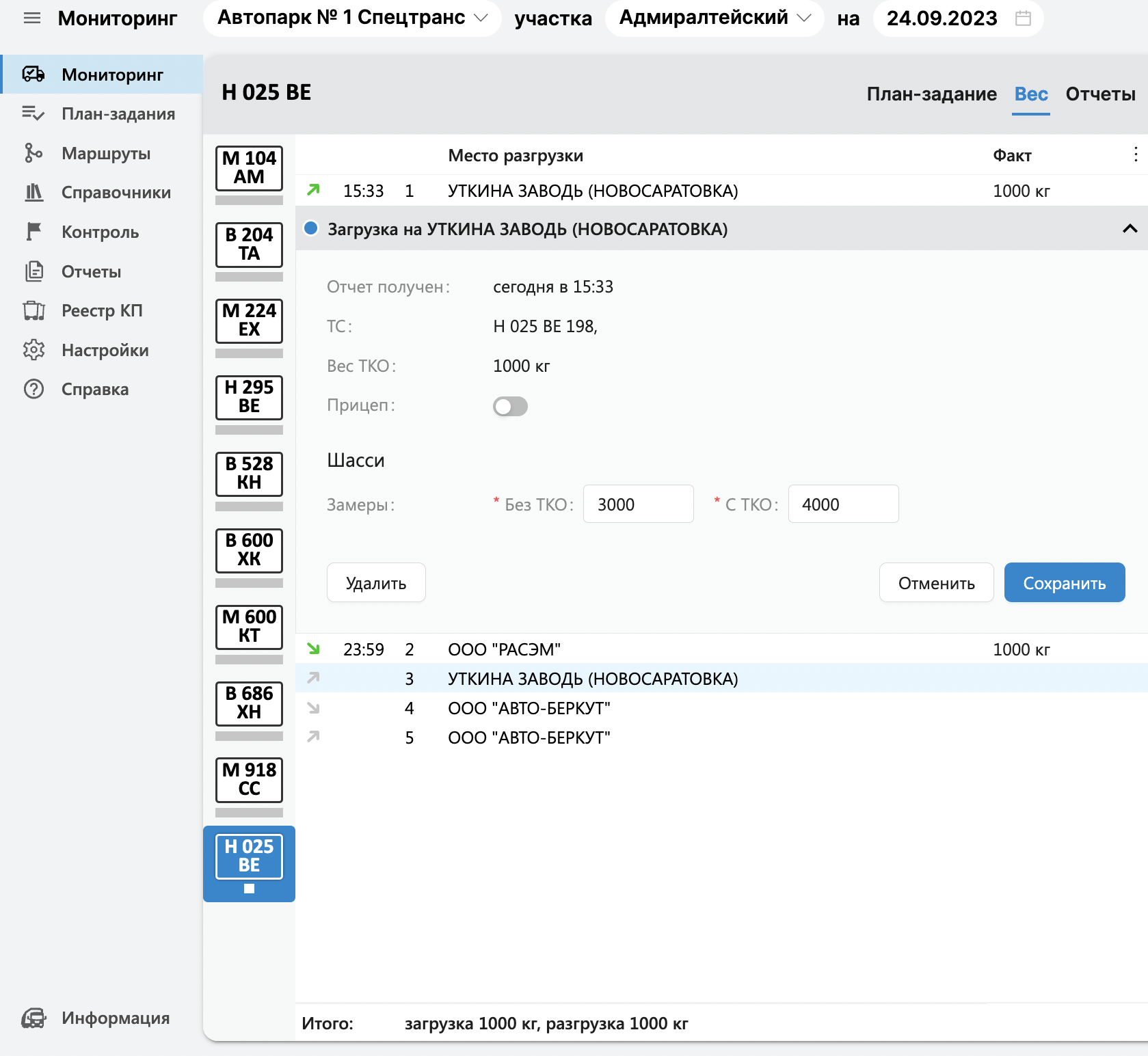 Отчеты о загрузке/разгрузке, который формирует водитель в мобильном приложении, содержат вес с ТКО / без ТКО. При необходимости выбранные значения можно скорректировать.