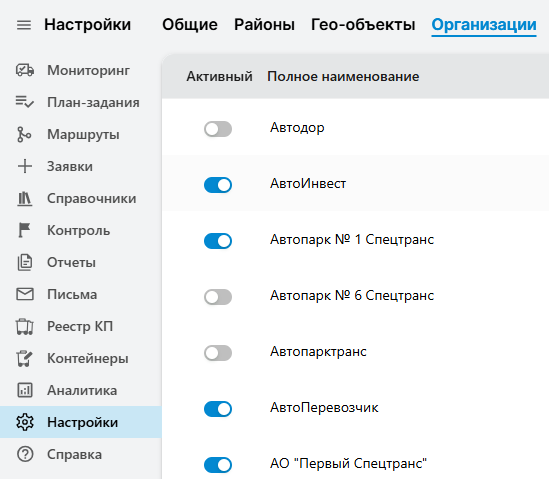 В разделе Настройки на вкладке Организации можно добавить и редактировать перевозчиков.