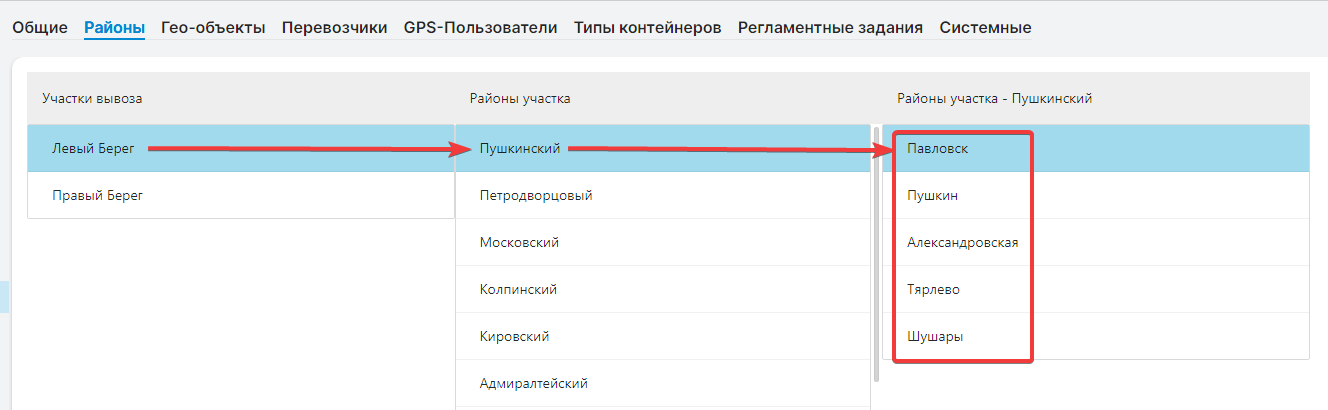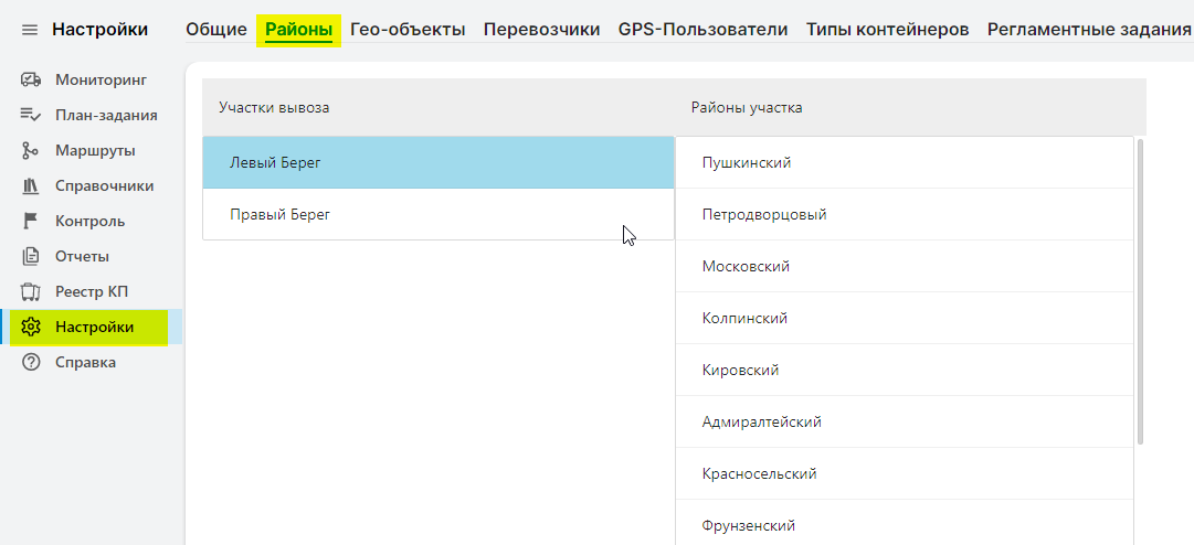 В разделе Настройки на вкладке Районы можно создать и редактировать районы.