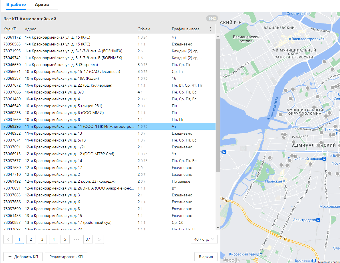 Реестр КП содержит полный список контейнерных площадок в зоне ответственности регионального оператора. Добавление площадки в реестр может быть сделано вручную либо через процессы верификации и инвентаризации КП.