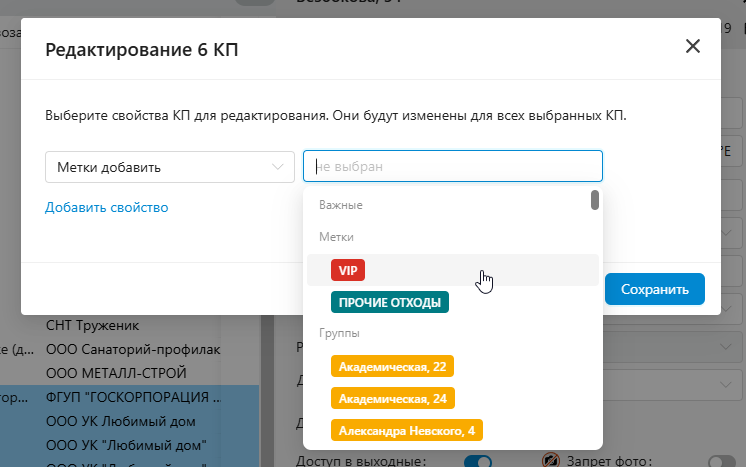Чтобы выбрать метку из созданных ранее, выберите ее из списка меток: