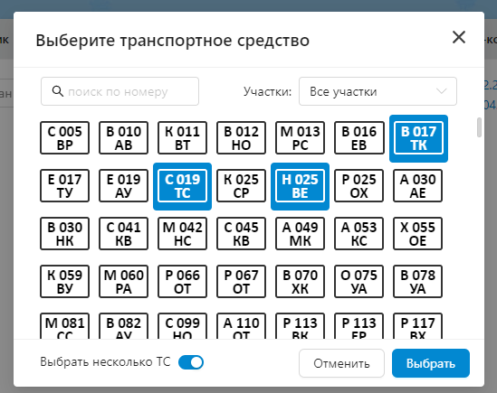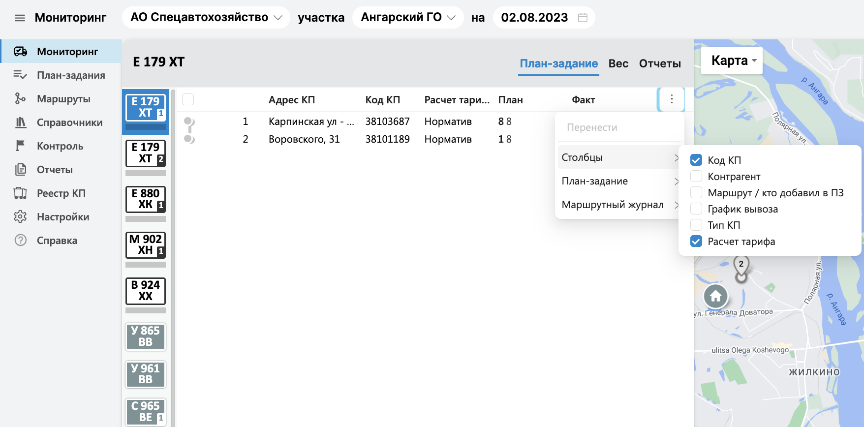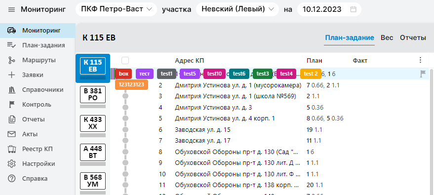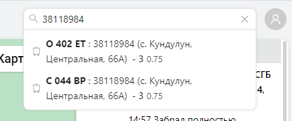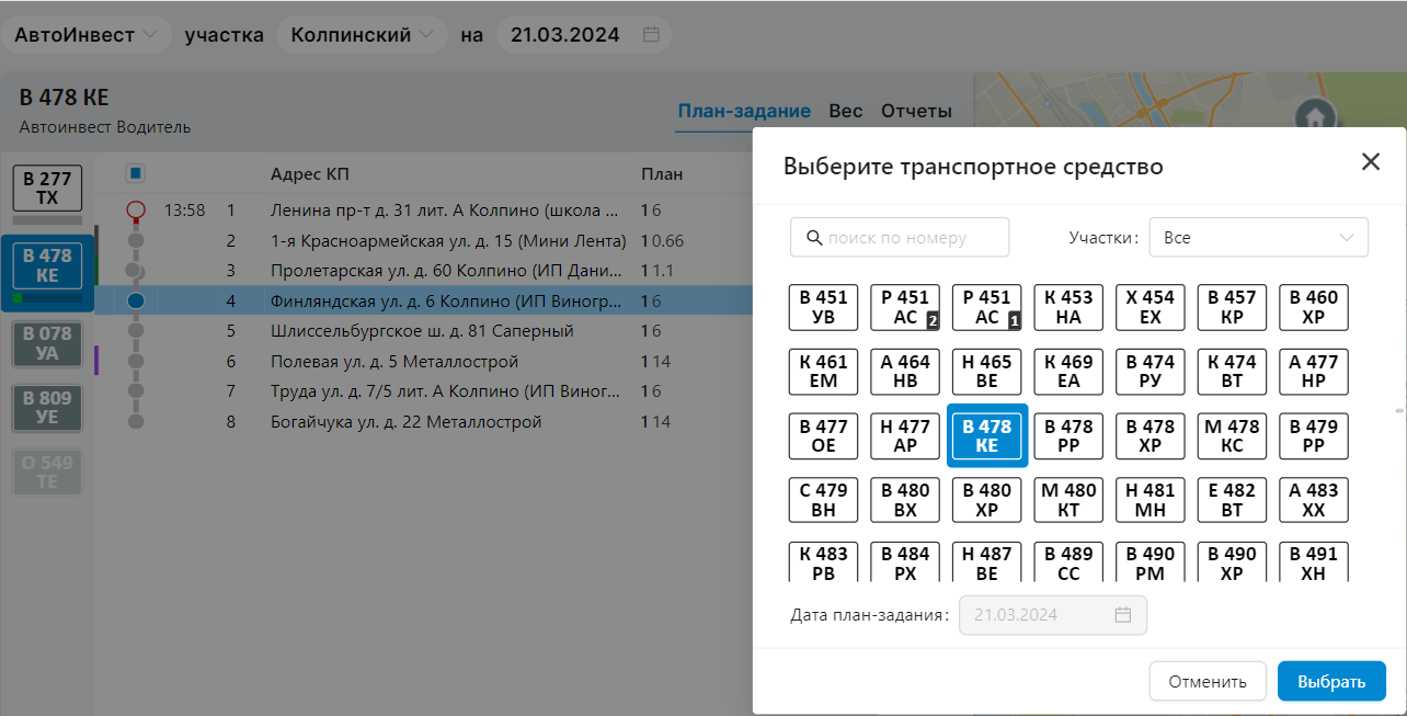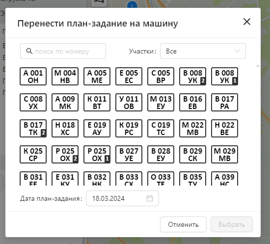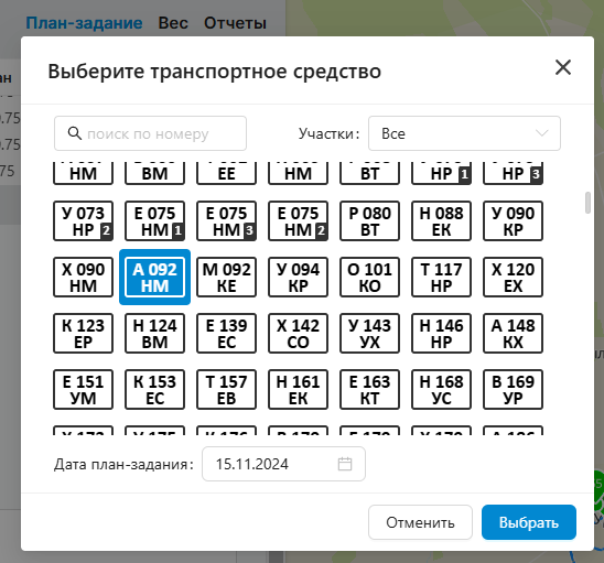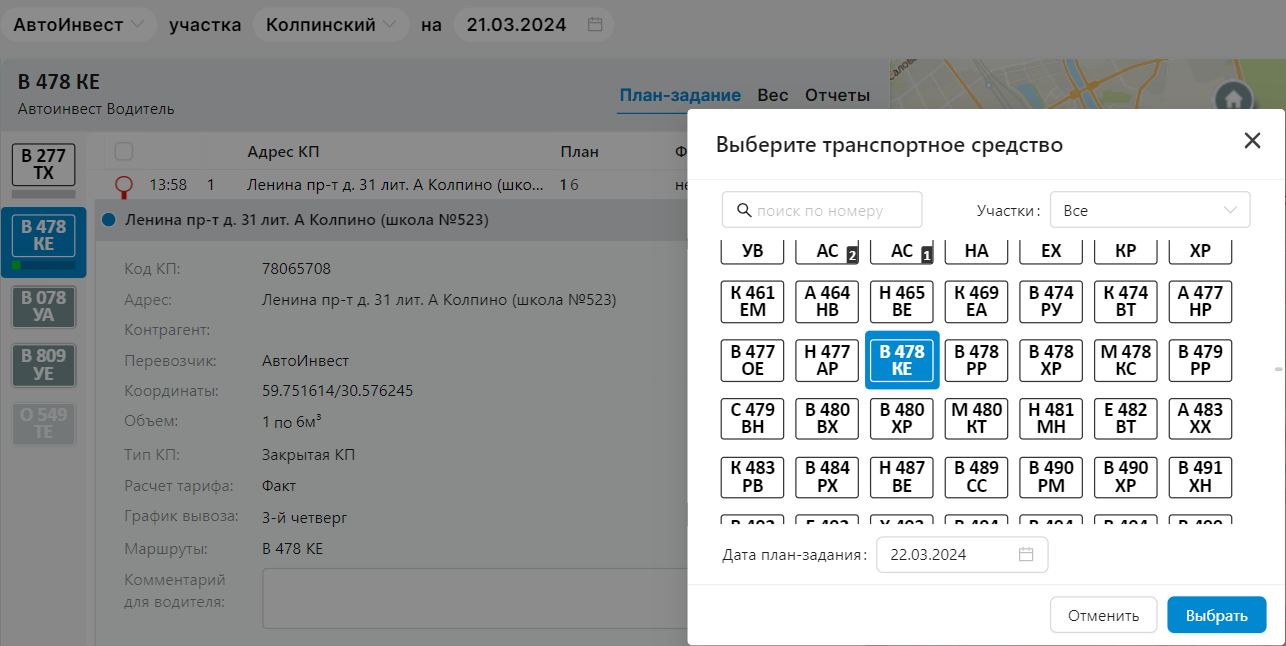 В мониторинге и редакторе ПЗ поиск отображает номера ТС и объемы КП