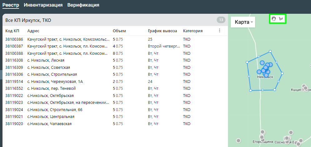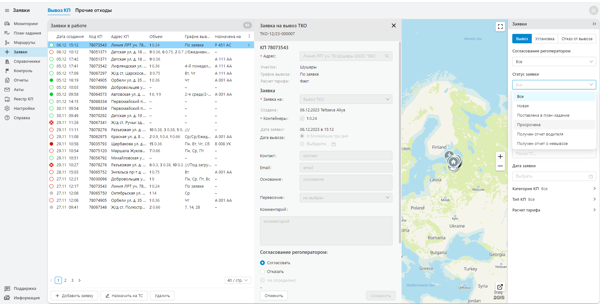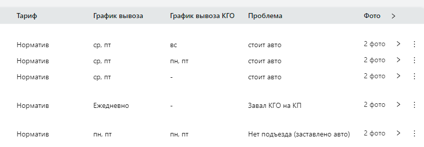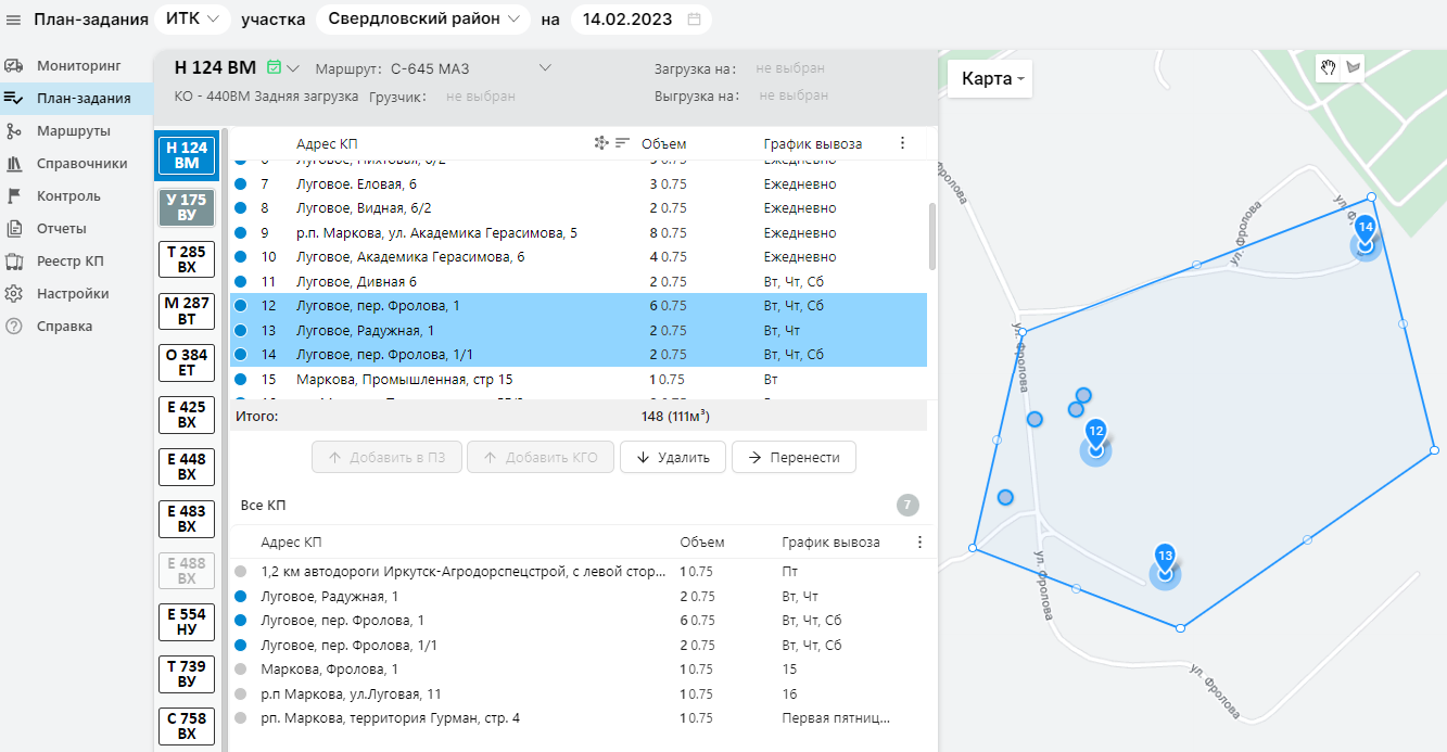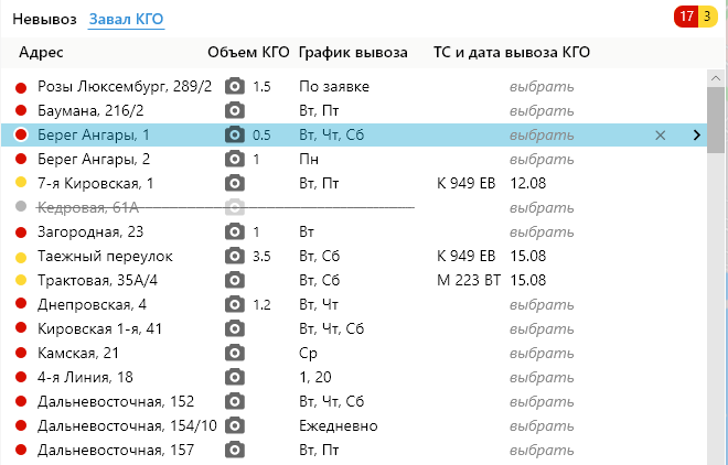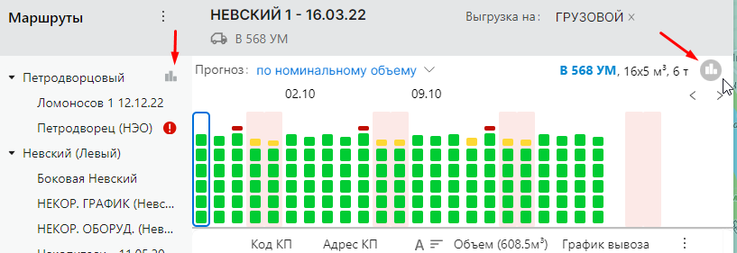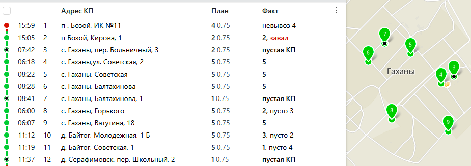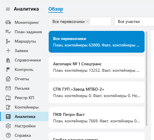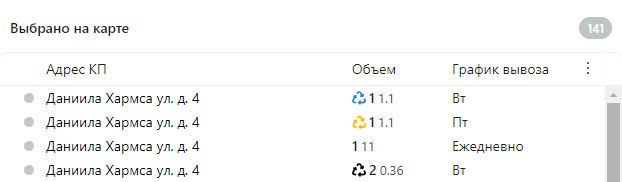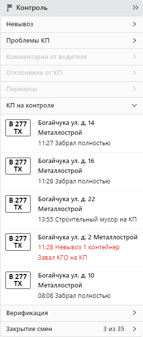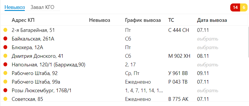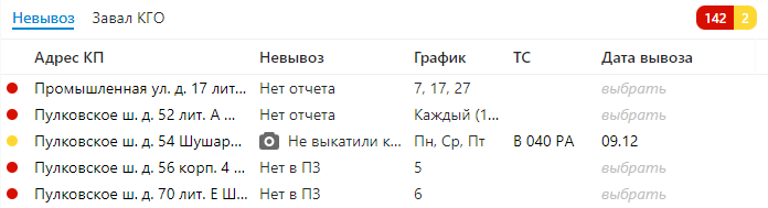 Раздел невывоз показывает все КГ, которые не были вывезены либо по отчету водителя, либо из-за нарушения графика в рамках выбранного участка. см. подробнее