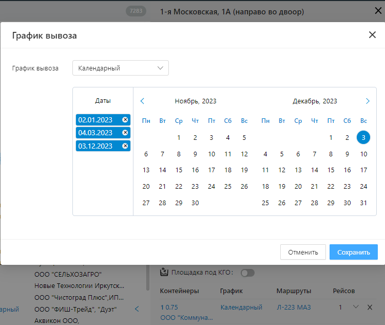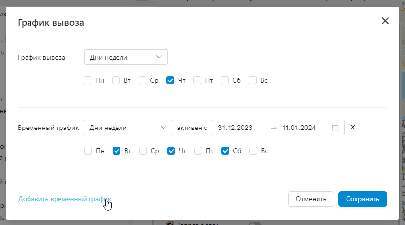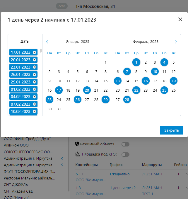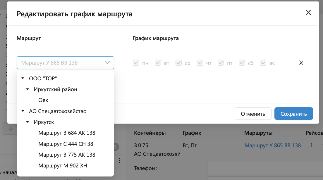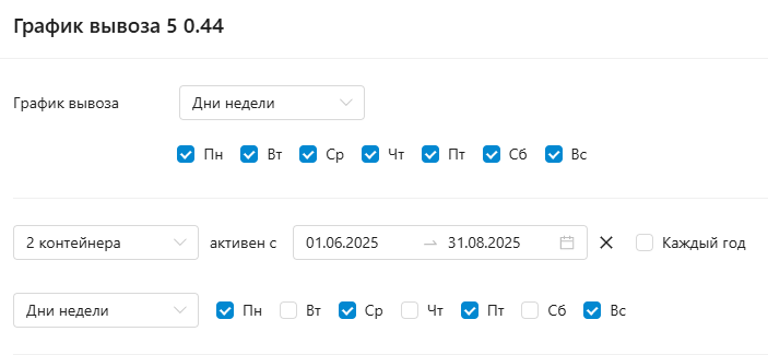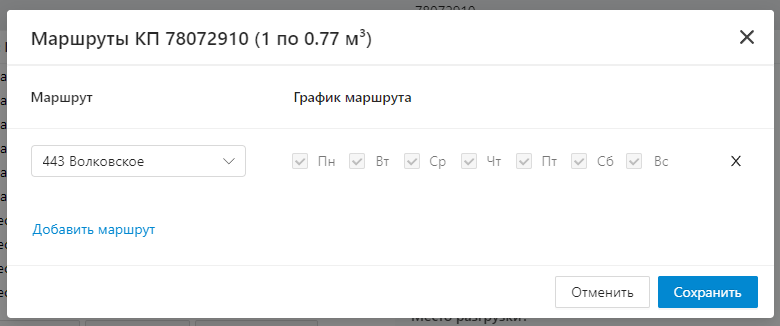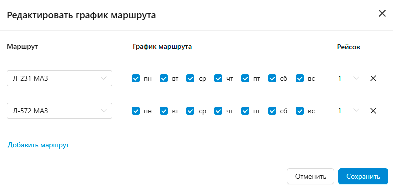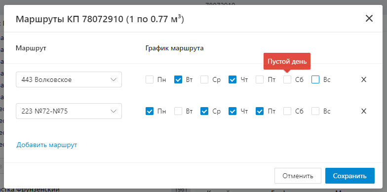 Когда у КП два и более маршрутов, система даст сохранить график маршрутов, только если галочки проставлены на каждый из дней недели.