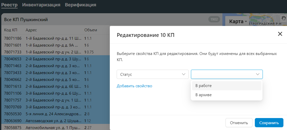 В раздел Реестр КП добавлена возможность массовой архивации КП с помощью массового редактирования