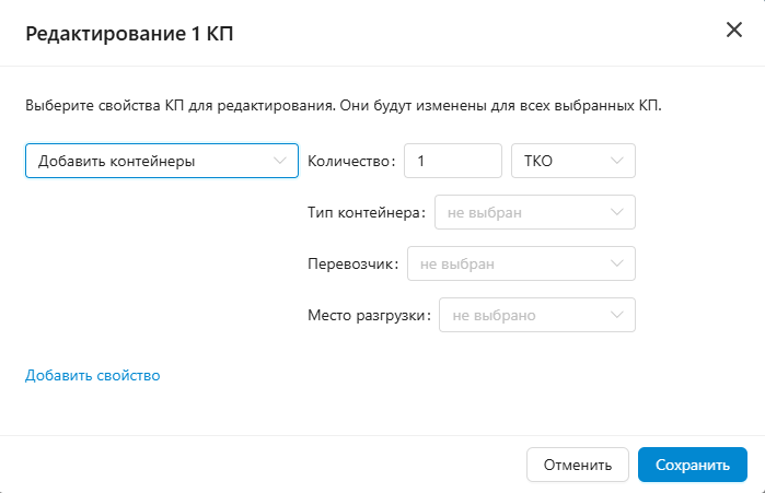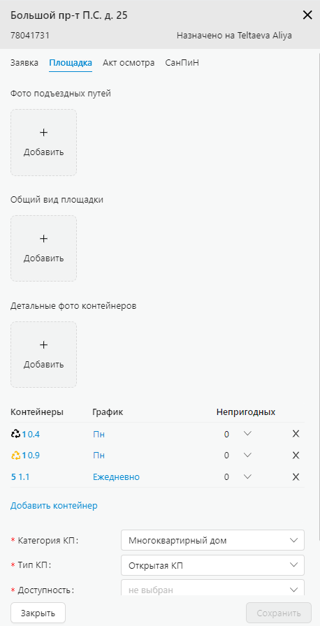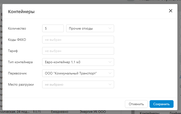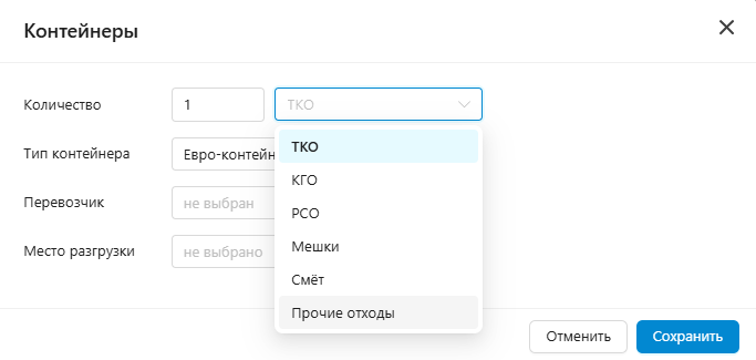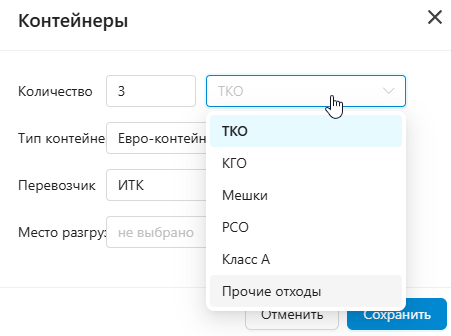 В разделе Контейнеры, в заявке на установку контейнера добавлены новые причины