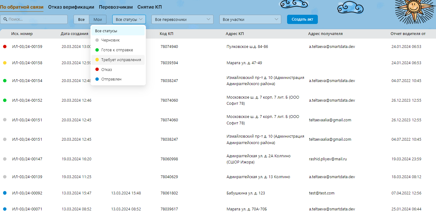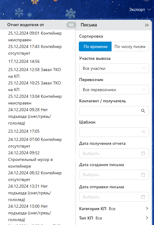 При нажатии на фильтр будут показаны все отчеты о вывозе, у которых отсутствует время прибытия и время выезда с КП