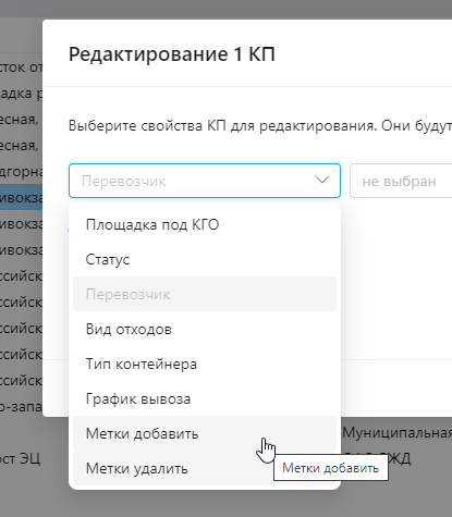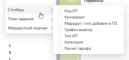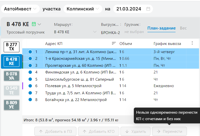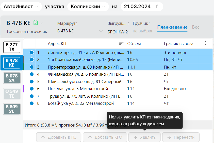 В Редактор ПЗ добавляется новая вкладка КП к вывозу. Раздел показывает КГ, вывоз которых запланирован на указанное в шапке число, и которые при этом не были поставлены ни в одно из существующих ПЗ на это число