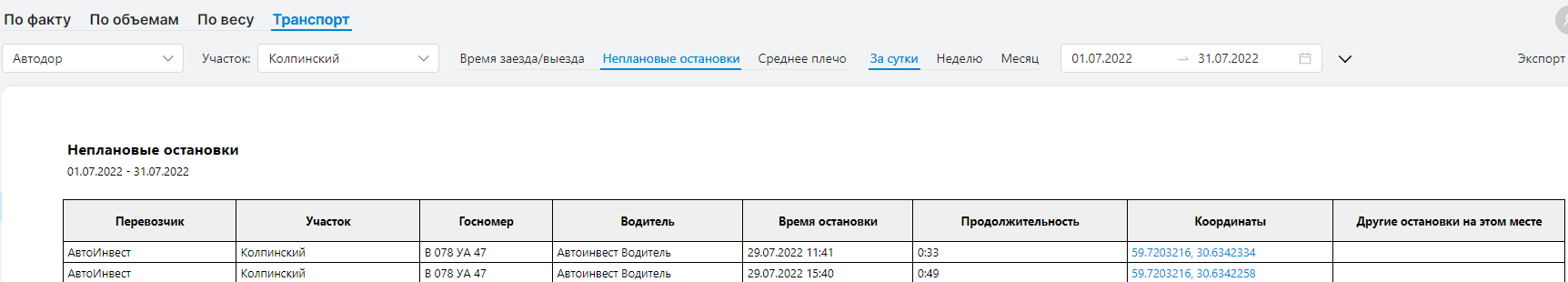 В раздел отчетов по транспорту добавлен новый отчет. "Неплановые остановки" отражает длительные остановки ТС более 5 минут, кроме остановок на КП, полигонах. см. подробнее