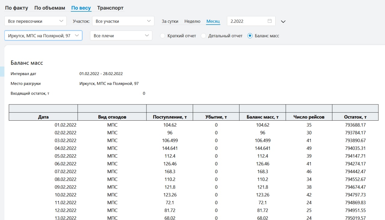 В раздел отчетов по весу добавлен новый отчет. "Баланс масс" отражает прибытие, убытие и остаток мусора на каждом месте разгрузки. Для расчета потребуется внести начальные данные в настройках полигона. см. подробнее