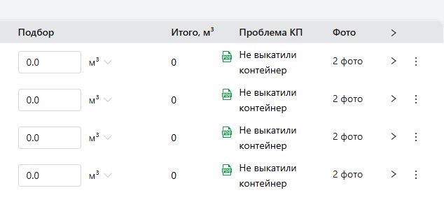 - При открытии отчета получаем данные по объемам, проставленные в ЛК. В случае несовпадения объем помечается красной иконкой с тултипом "Объем в ЛК - 2 м3"