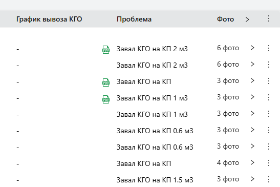 Раздел завал КГО показывает отчеты по КП, по которым указана проблема: "Завал КГО на КП", "Завал не ТКО на КП", "Завал ТКО на КП", "КГО в контейнере", "Контейнеры переполнены". см. подробнее