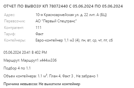 В содержимое отчета добавлены новые поля: План и Факт - отражающие запланированное и фактически забранное количество контейнеров в рамках вывоза