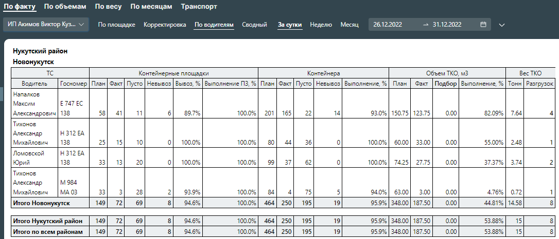 Отчет формируется по водителям перевозчика и отображает процент выполнения в разрезе по: