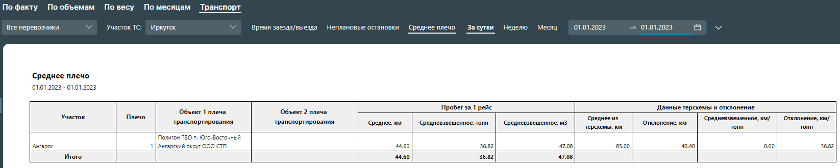 В отчете отражаются средний пробег всех ТС участка 1 и 2 плеча до объекта разгрузки и средневзвешенное значение перевозимого ТКО на объекты разгрузки: