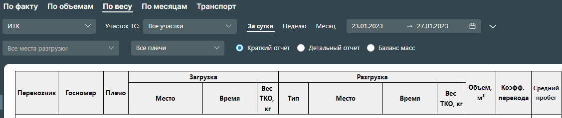 Отчет отражает загрузки и разгрузки ТС на местах хранения ТКО и включает название полигона, время и вес загрузки либо разгрузки. Для работы с отчетом можно установить фильтры: