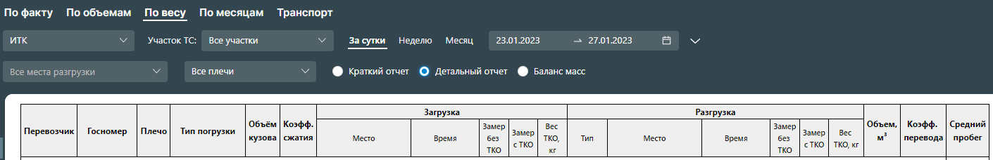 В детальный отчет по весу добавляется вес ТС с ТКО и без ТКО, а также объем кузова и коэффициент сжатия ТС.