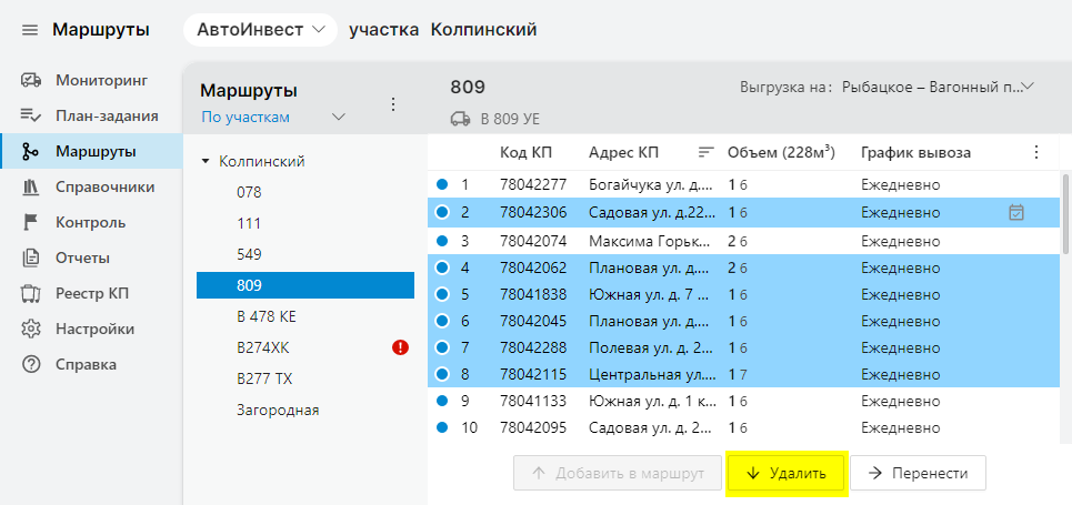 Удаление КП из маршрута