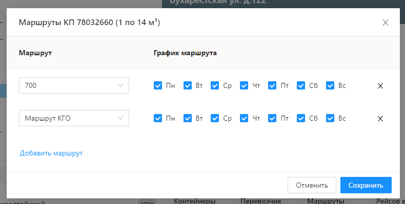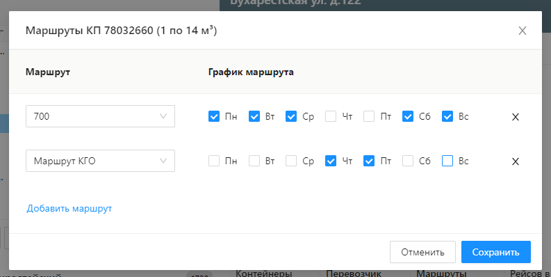 При нажатии на название маршрута откроется редактор графиков маршрутов. В нем можно указать, в каком именно маршруте контейнерная группа должна находиться в каждый из дней недели. Чтобы избежать дублирования КП в план-заданиях, группа не должна находиться в двух и более маршрутах в один день.