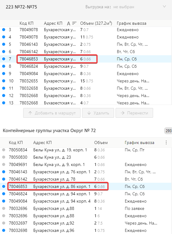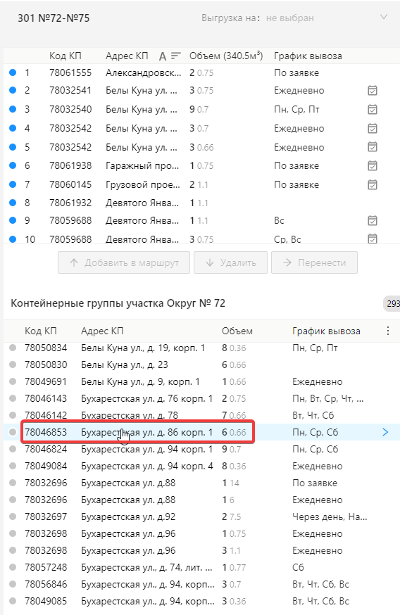 В редакторе маршрутов две таблицы - с текущим маршрутом и контейнерными площадками выбранного участка. В окне глобального поиска можно выбрать, где он будет происходить.