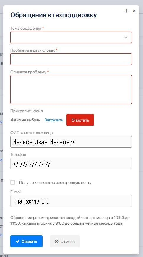 Нужно заполнить поля “Тема обращения”, “Опишите проблему в 2 словах”, “Опишите проблему”, есть функция прикрепления документа, контактные данные проставляются автоматически, можно получить ответ на электронную почту, не забудьте для этого поставить галочку в соответствующем чек-боксе. После нажмите [Создать] и ждите ответа специалиста.