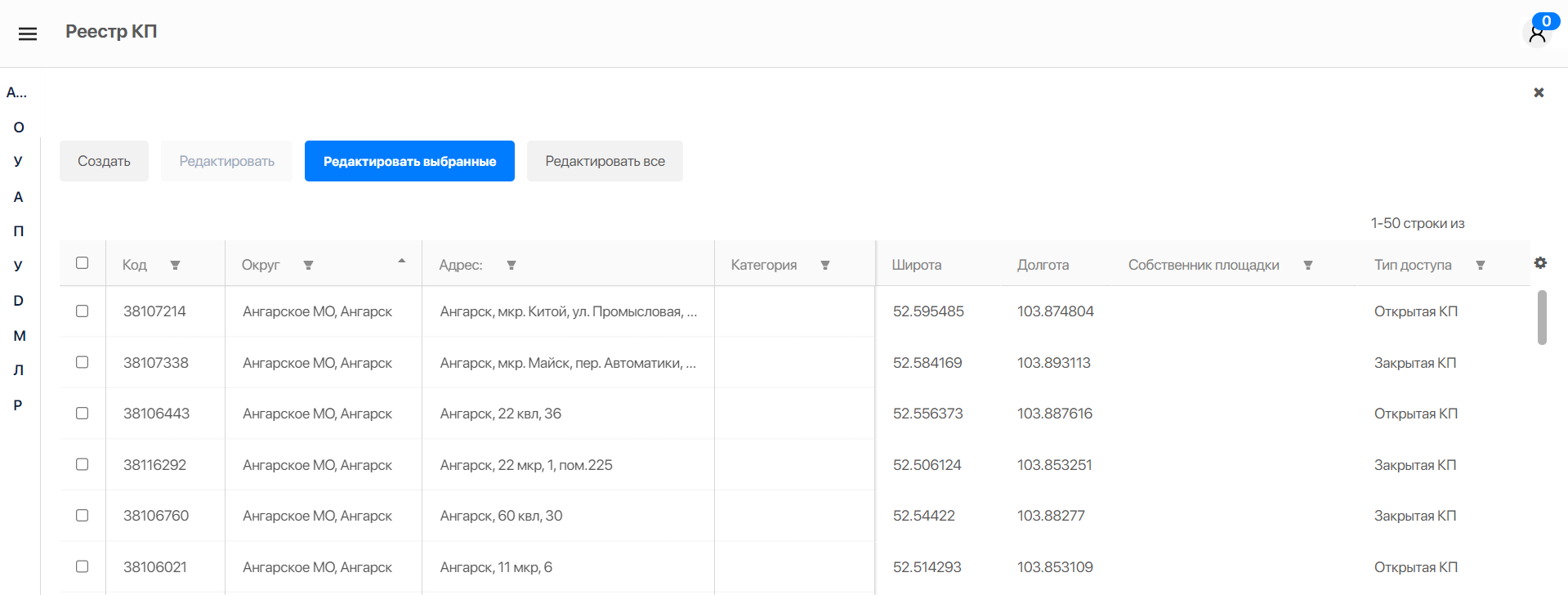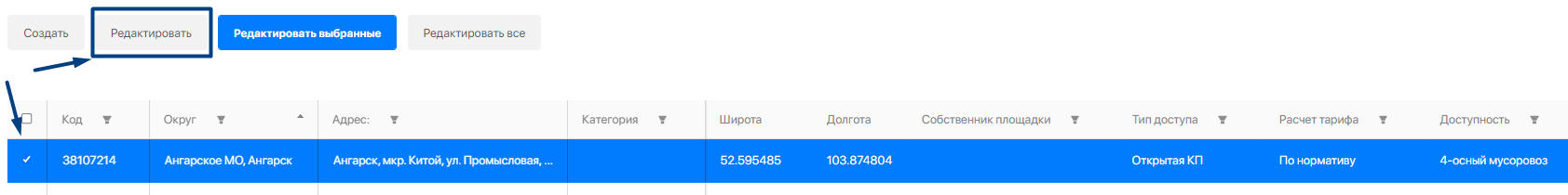 В реестре контейнерных площадок можно просмотреть все КП, сохраненные в базе данных, внести в них изменения. Редактирование возможно как отдельной площадки, так и групповое. В этой вкладке есть возможность также создать новую КП.