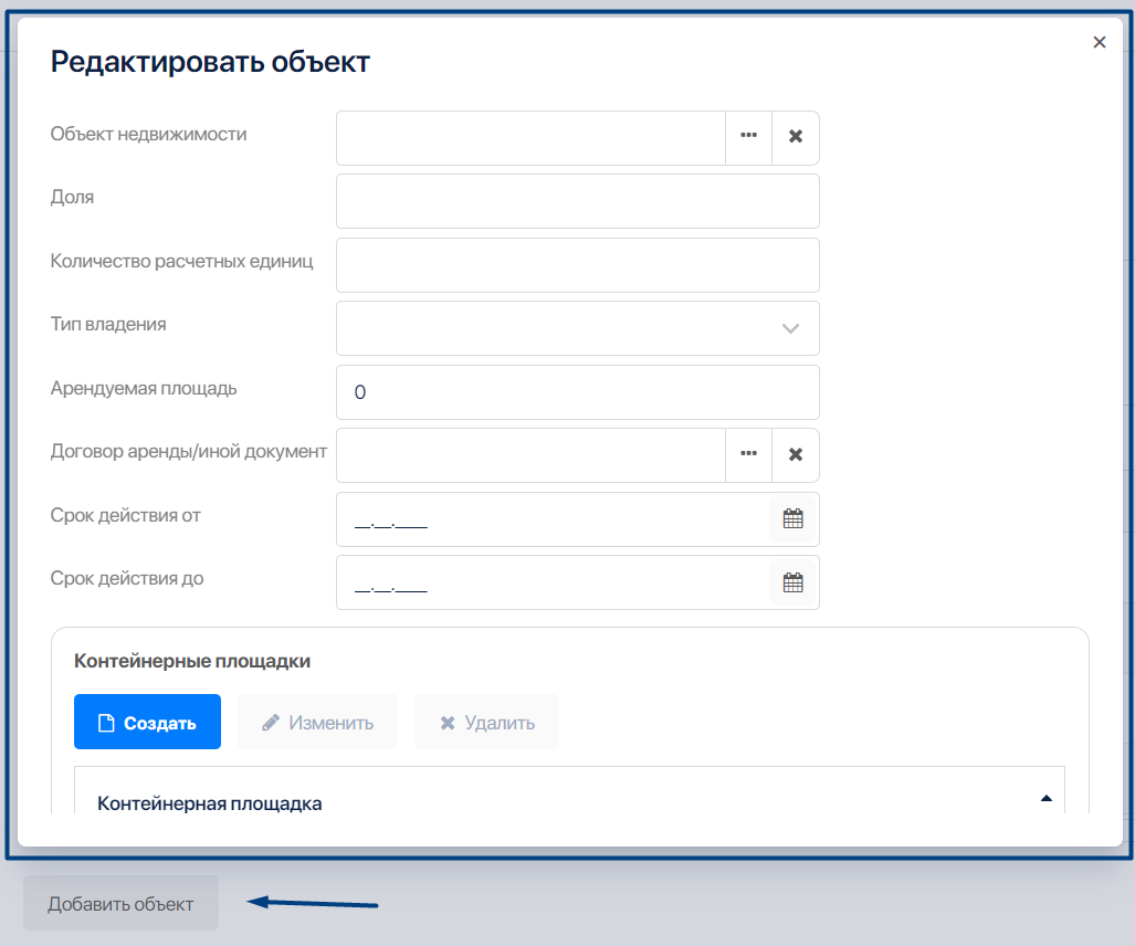 Создание образователя Функционалом раздела предусмотрено создание объекта. Для этого нужно внизу страницы нажать на кнопку [Добавить объект], а после в появившейся форме заполнить все поля и кликнуть [Сохранить].