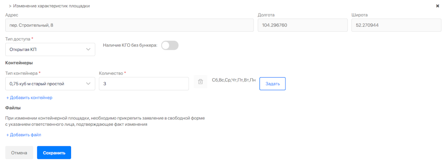 - Внести необходимые корректировки значений в появившемся окне. Обратите внимание: можно изменить тип доступа, добавить новые контейнеры, изменить количество уже сохраненных контейнеров и график их вывоза, прикрепить документы. После всех изменений обязательно нажать [Сохранить], чтобы изменения были зафиксированы.