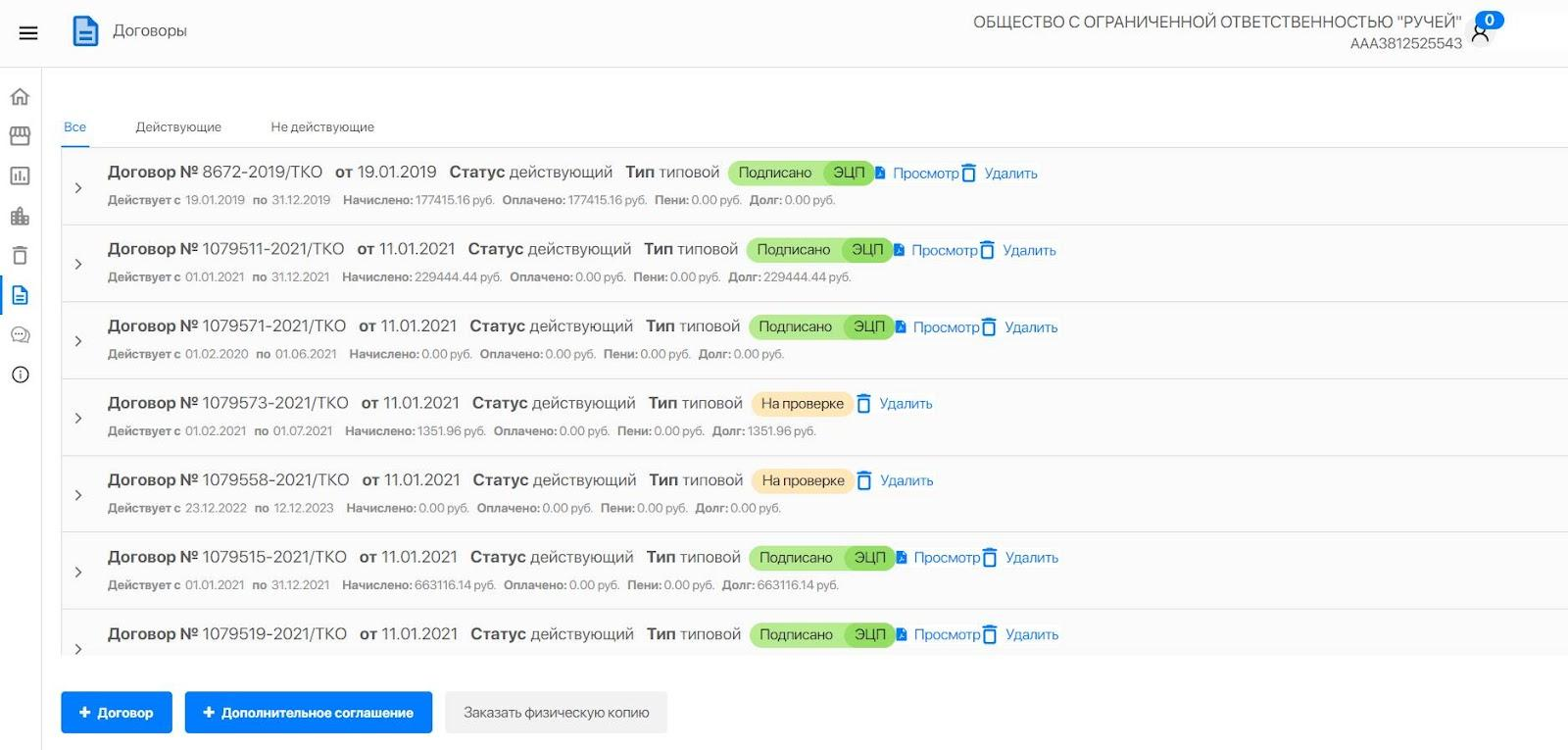 Во вкладке «Все» можно увидеть все заключенные договоры. Те, которые еще актуальны – во вкладке «Действующие». Утратившие силу – во вкладке «Не действующие».
