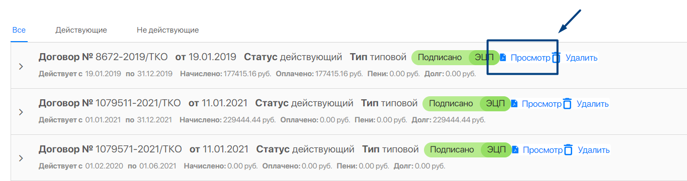 Для просмотра интересующего договора нужно нажать на соответствующую кнопку напротив документа. Договор откроется на новой странице в формате PDF.
