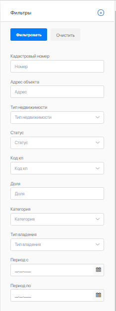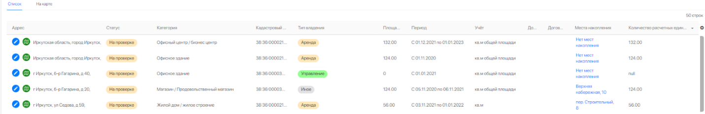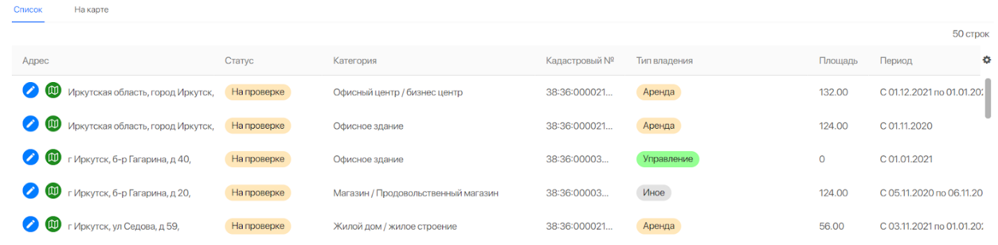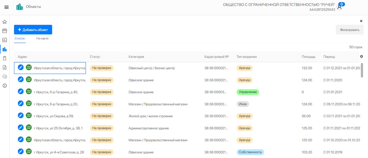 При выборе вкладки «Объекты недвижимости» пользователь видит все добавленные объекты недвижимости в виде таблицы.