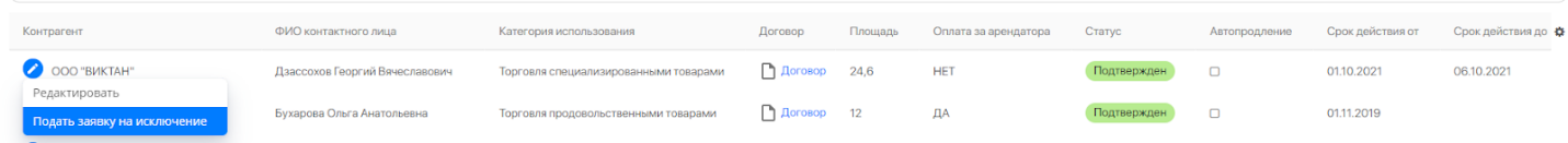 - Найти в появившемся списке нужного арендатора и нажать на «Подать заявку на исключение»